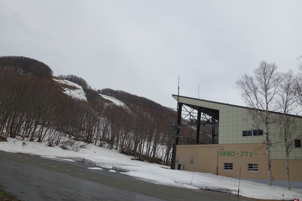 青森空港から奥入瀬へ行く途中、八甲田十和田ゴールドラインで八甲田山を通りました。道路沿いに八甲田ロープウェー乗り場があり、広い駐車スペースがあったので、ここに車を止めて休みました。GW期間中でしたが、この辺りは雪がまだたくさん残っていて、スキーをやっている人もいました。