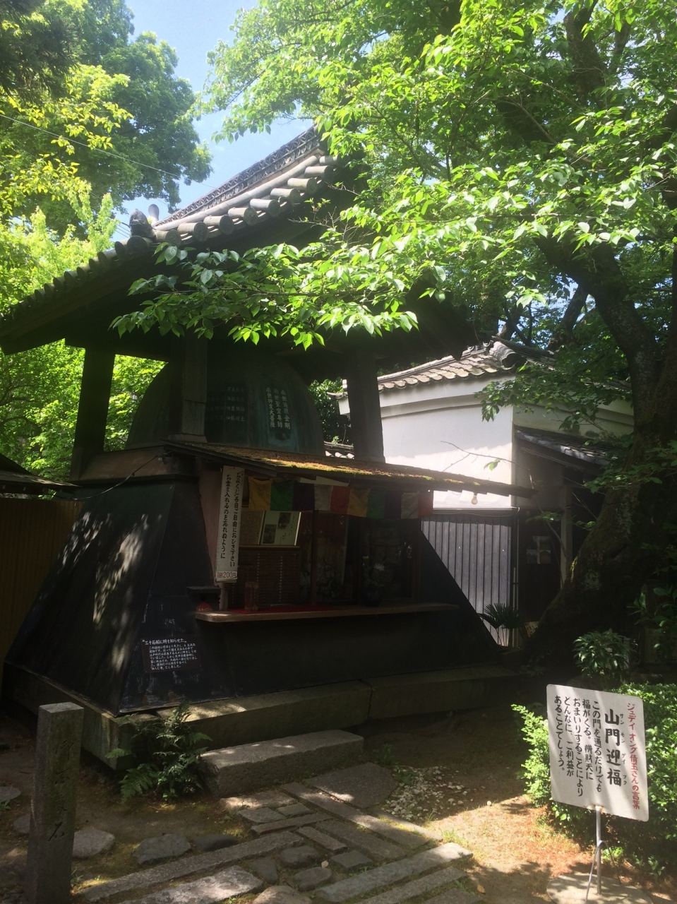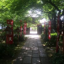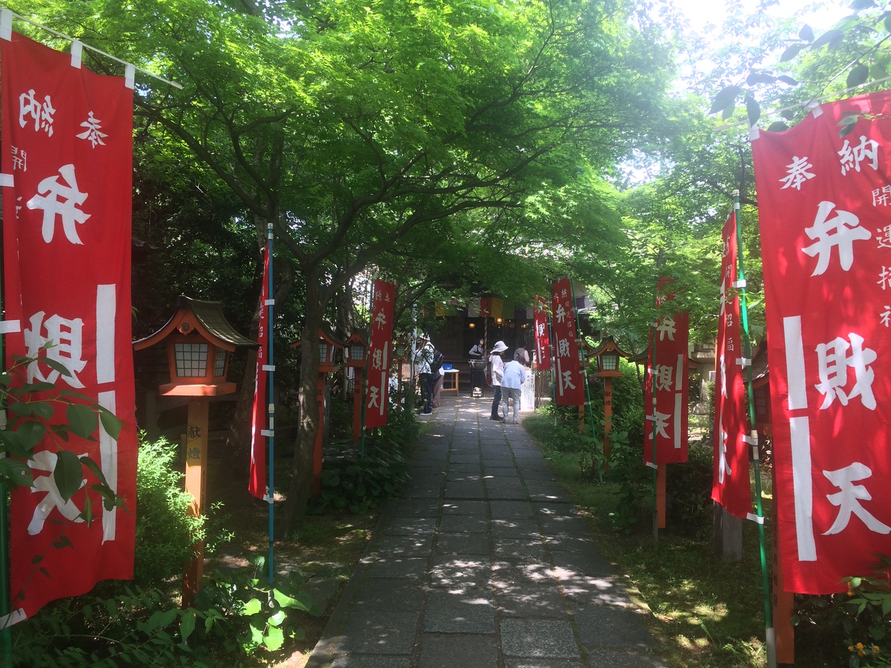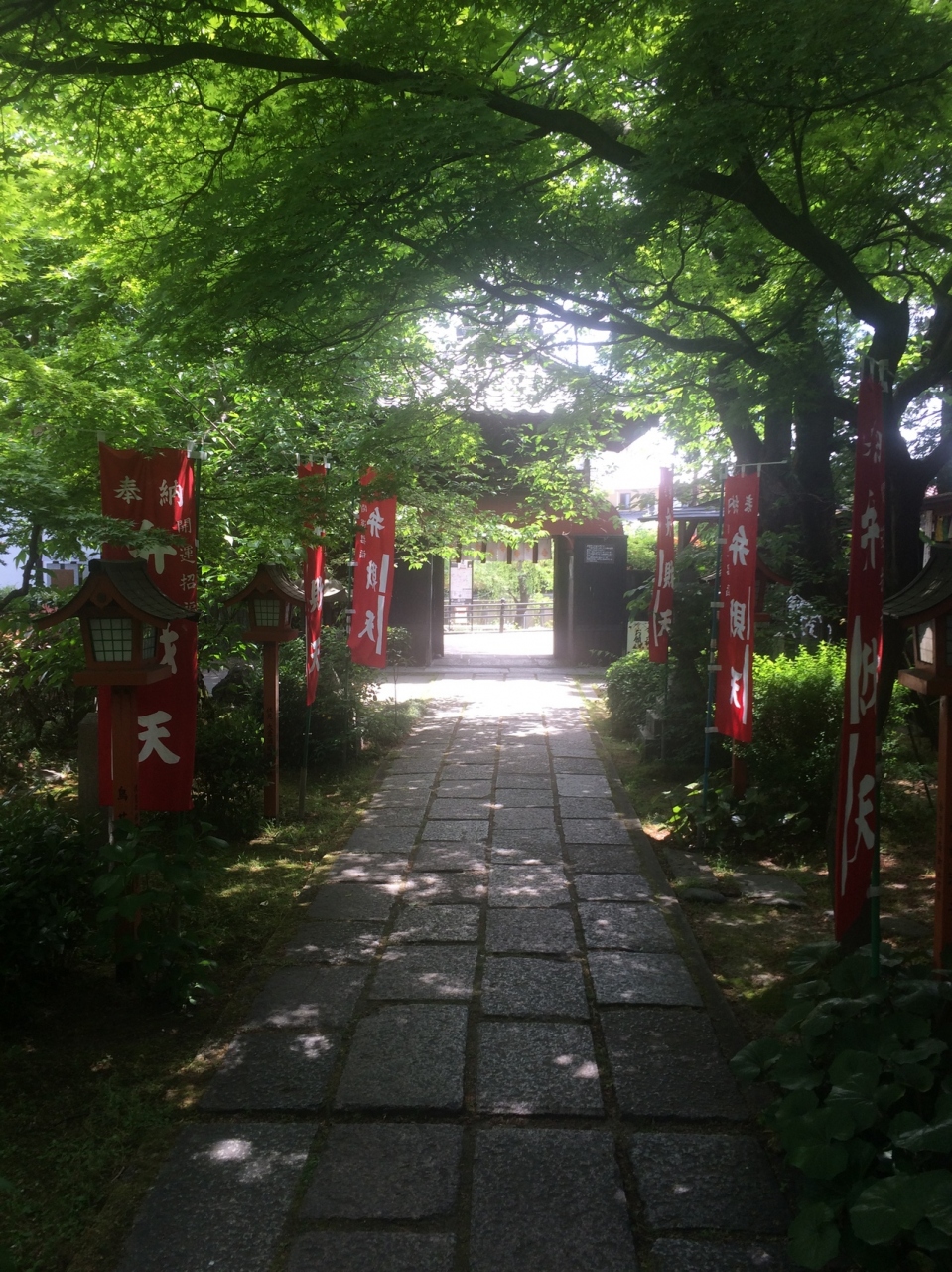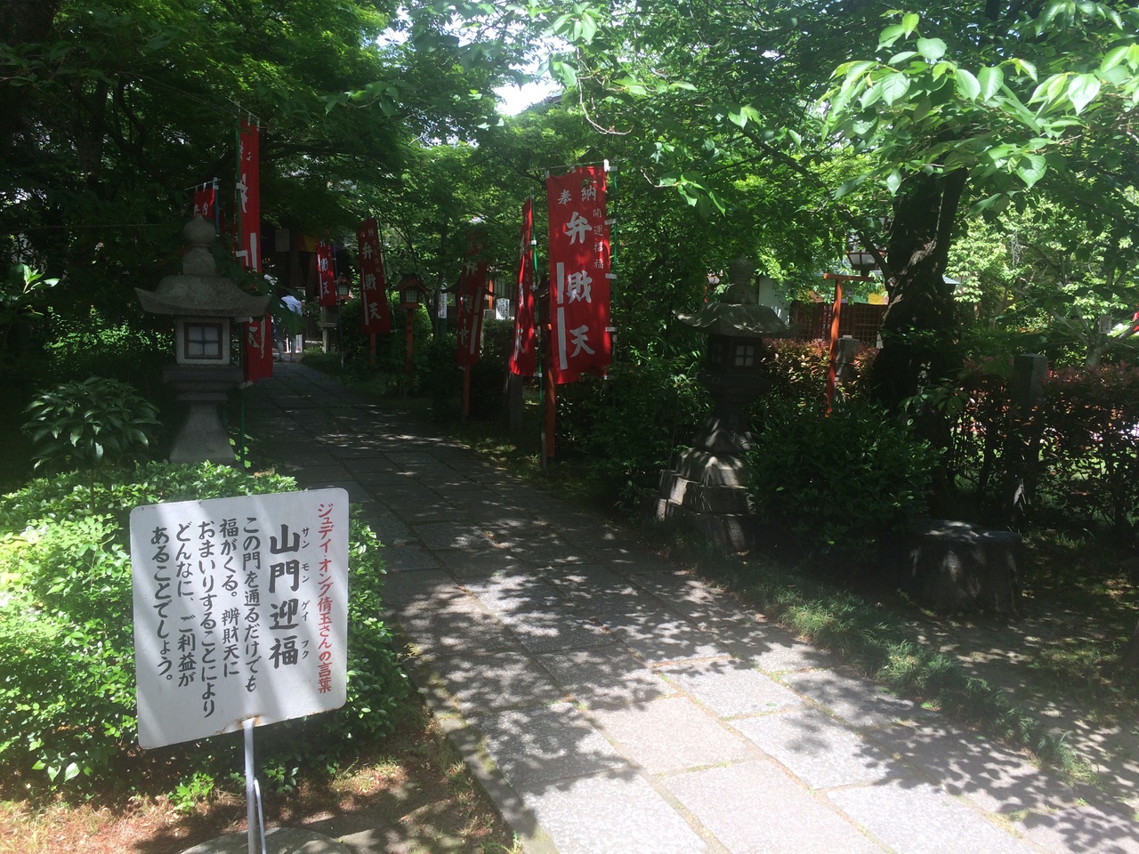 十石船船乗場の目の前にある寺で土塀が赤く、竜門造りの門をくぐると石道がひかれ本堂まで直ぐでこじんまりした境内の木々の新緑と弁財天の赤い旗が左右に立っている雰囲気が良かったです。イチョウの木が大きく見応えがありました。