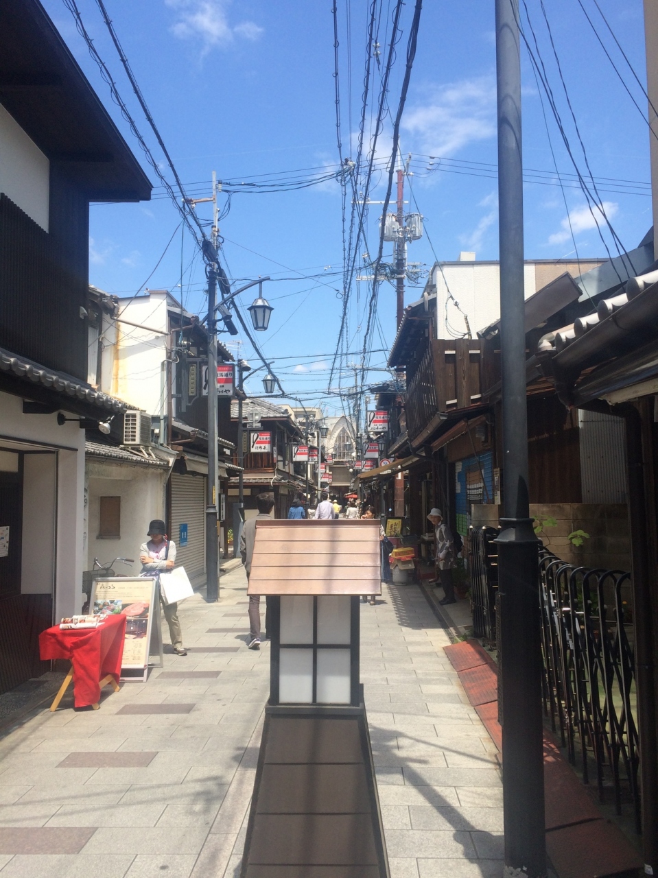 宇治川派生の橋からブラブラと歩きました。車1台通れる広さですが10時~21時は車通行禁止でした。左右には喫茶店、酒屋、漬物屋等がありました。店の数は少なめでごちゃごちゃ感がなく人がまばらなのでゆったり歩きました