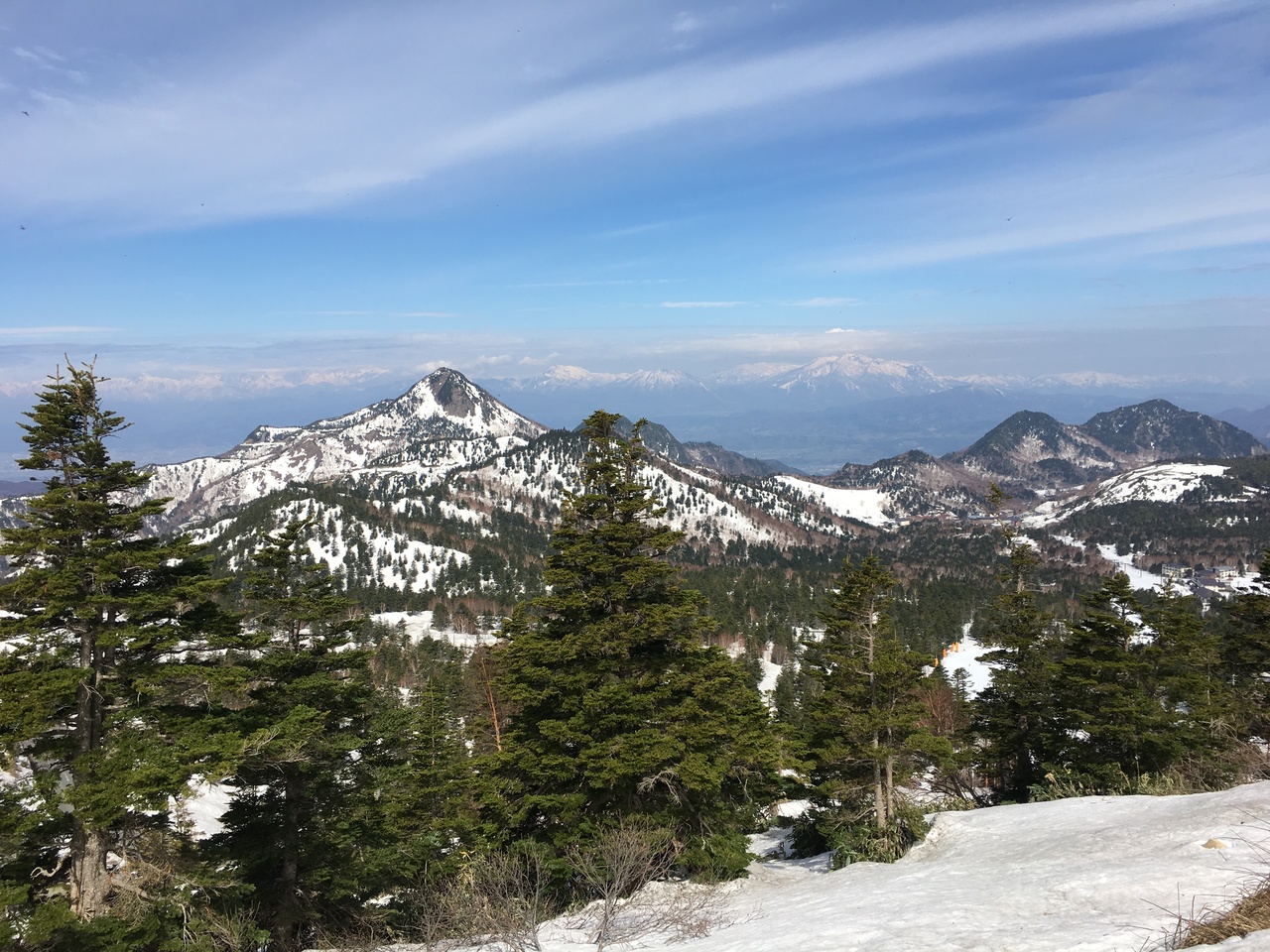 志賀高原で春スキーを楽しんだ後、草津方面に抜けるために志賀高原道路を利用しました。途中に横手山ドライブインがあり、みんな景色を楽しんでいました。駐車場が狭くたくさん車が止まっているので、タイミングが良くないとかなり気を使うかもしれません。でも景色はかなり良いので、面倒がらずに頑張って駐車した方が良いと思います。