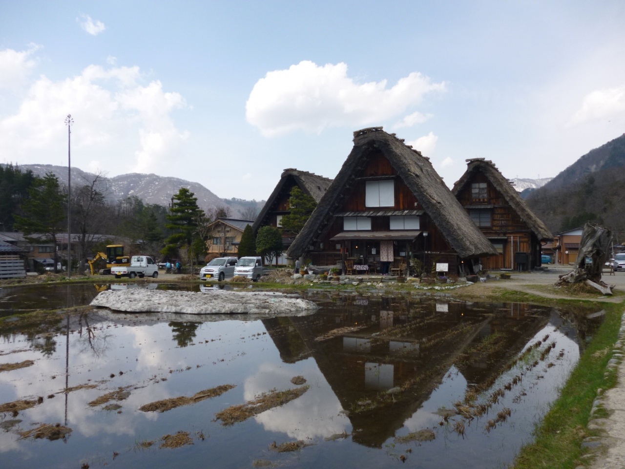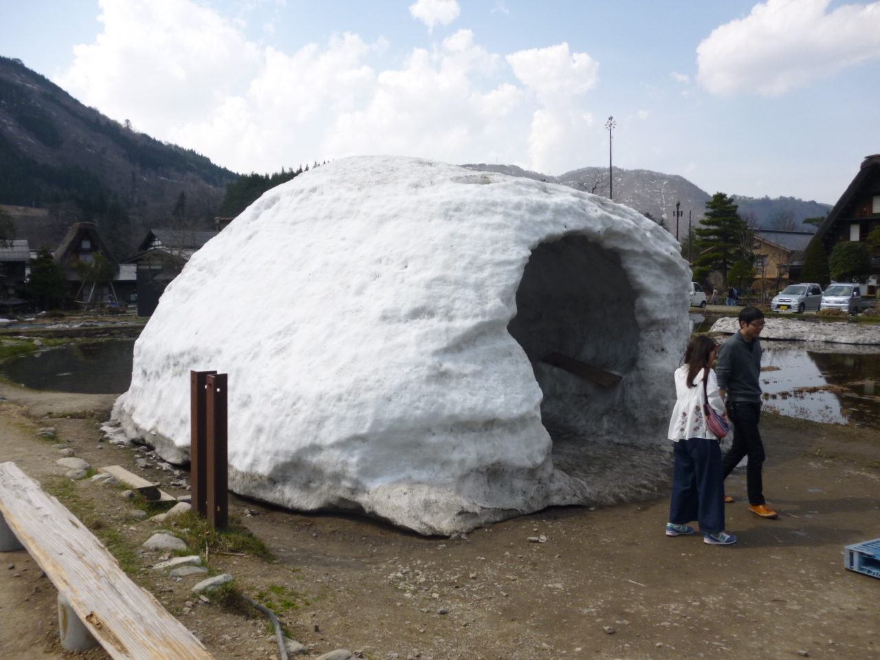4月の中旬に訪れました。道路に雪はなく全く問題ありませんが、豪雪地帯なのか、まだ雪のかまくらが作ってありました。集落内の白川街道は車両進入制限時間があります。せせらぎ公園駐車場が満車で、臨時駐車場のみだしま公園駐車場に止めました。駐車料金は500円でした。ちょうど白川郷集落の南端から見学することができます。合掌造りの家は見学可能な家もあり、昔の農機具や道具等が展示されています。