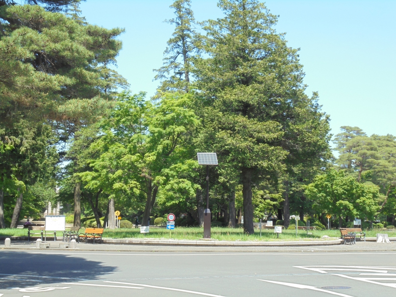 車でも園内を通行できます。バス通りの南側の出口では赤点滅の信号に従い進むのですが、白バイ隊員が高頻度で物の影に隠れて一時停止を見ています。安全を優先するのであれば道路の拡幅を考えた方が良いと思うのですが...