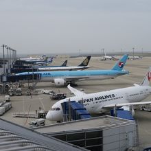 夜だと、あまり壮観さはないが、昼だと、特に国際線はいろいろなデザインの飛行機が駐機されているのが、なかなかの圧巻。