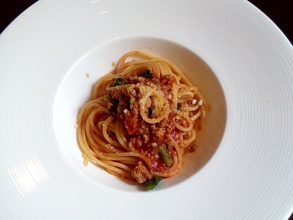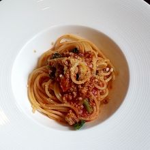 パスタはサルシッチャを使ったトマト系。前にお台場で食べたパスタと同じかな?