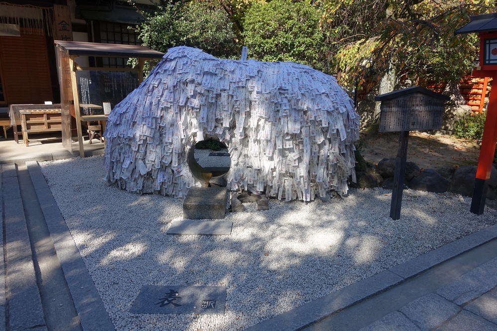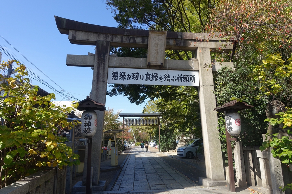 縁切りと縁結びにご利益のある神社。建仁寺の東、住宅街に囲まれた意外と狭い境内です。東大路通のほか北と南にも鳥居があり、いつでも自由に入れます。境内で最も目を惹くのは「縁切り縁結び碑」。巨石の真ん中に人間が一人やっと通れそうな穴が開いています。石と言っても大量のお札が重ね貼りされているため、元の石の姿は見えません。