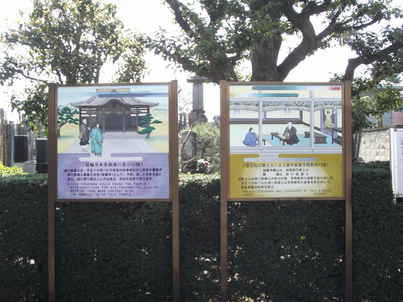 参道左手に、「瑞輪寺本堂創建の喜びの図」 と 「慈雲院日新上人による徳川家康学問教育の図」 があり、開山の慈雲院日新上人と開基の徳川家康の関わりが窺えます。