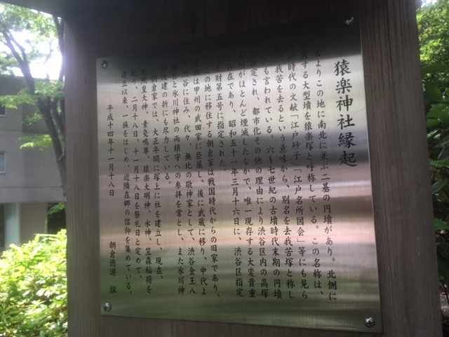 小高い山が猿楽塚です。古墳時代末期の墳墓でそうです。ここには塚があるだけではなく、小高い山の上には猿楽神社があります。「猿楽」は、元々「我苦を去る」という意味から、別名を「去我塚」と称したとも言われています。つまり、自分の苦しみを取り去ってくれるのです。縁起を読んだので、心を込めてお参りしてきました。