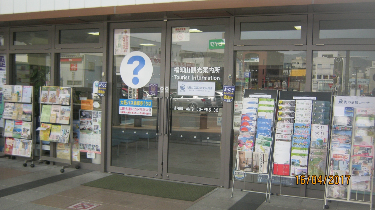 福知山駅のビルを出ると右手に観光案内所があります。すぐわかります。入り口にはiのマークではなく?マークになっています。でも観光案内所です。福知山に関する資料をもらえます。いくつかあります。福知山の市街だけでなく近郊の資料もあります。