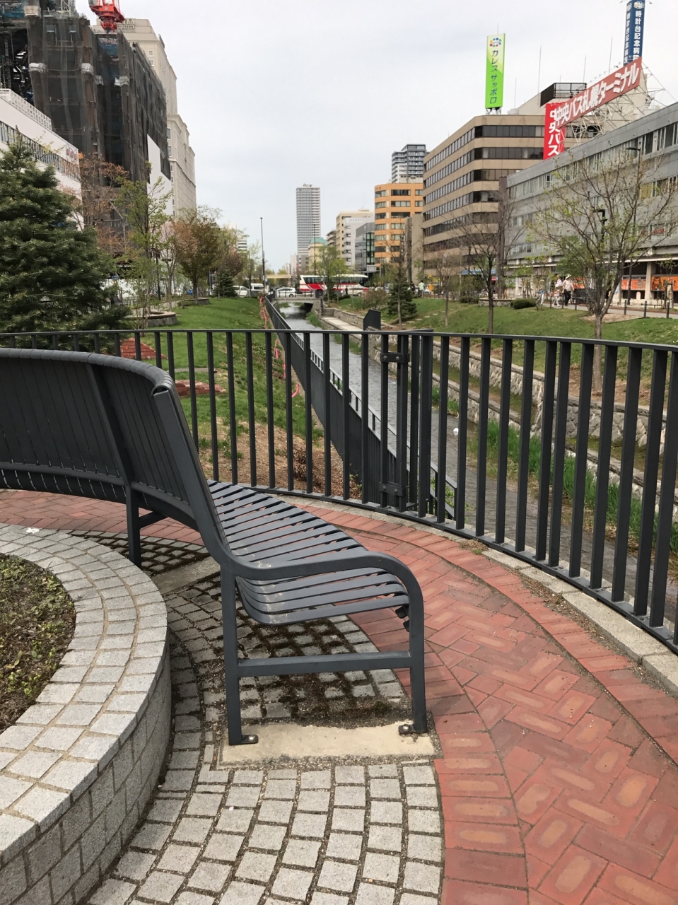 創成川の南4条から北2条までの間にある川の両側にある公園です。近くの保育園児数名が手をつないで先生と共に散歩で訪れていました。園内の自転車の乗り入れは禁止されていて降りて通行します。川の両岸は車の往来が多く信号を利用して安全に気をつけます。おすすめはこれからの時期に咲くライラック鑑賞です。色も香りも楽しめます。30種類ほどもあるそうで開花時期が違っていて長く楽しめます。トイレは狸小路近くにあります。