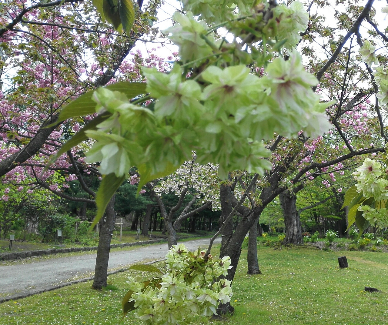弘前城の桜祭が終わり、静けさが戻ってきた感じです。お城の公園内に有る、植物園が今緑の桜が見ごろを迎えていて、ピンクの桜との共演が素晴らしく、一見の価値有りです。