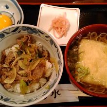 お昼のランチセットで牛丼とおそばのセット830円を注文。牛丼には生卵がついていました。お腹いっぱいになりました。