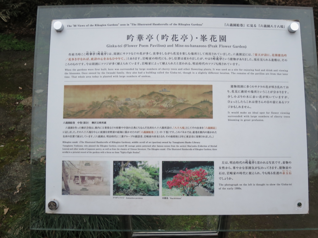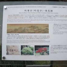 六義園の池を出汐の湊から右回りに進んで行き千鳥橋を越えた最北西部辺りに吟花亭跡がある。吟花亭跡がある場所の前にはもう一つの高いしだれ桜があり、この桜に見とれていたところ後ろに立て札があって初めて吟花亭跡があるのに気付いたほどで、何もなければ通り過ぎてしまいます。よく見ると礎石等がの遺構がありました。このしだれ桜で花見をするために建てられたのかもしれませんね。