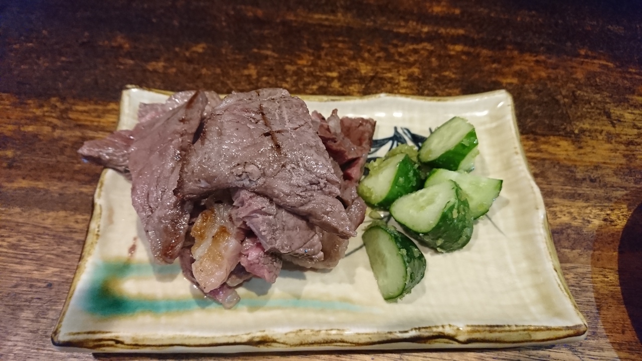 美味しいお肉が食べられると、blogか何かで読んで、事前にリサーチの上訪問。駐車場の建物の中に入口があり、調べていなければ絶対来ないと思う。かなり入りにくい。看板がなければ絶対にわからない。土曜日の20時くらいに訪問しましたが、そのときはお客はゼロ。心配になるものの、カウンター席もあるので、一人でもなんとかと考え勇気をもって入りました。焼肉とステーキがあり、今回は焼肉(並)S(1600円)とキムチ、スープ、サラダ、ライスのセット(プラス500円)を注文。お肉は網焼きにされ、5分くらいで提供。お肉の提供は、まるで居酒屋のような感じで盛り付けられる。お肉は塩味のみで、一切てを加えられていない。しかし、柔らかい。肉本来の味がわかる。タレをつけるとまた美味。タレはしつこくなく、肉の味を壊さない。スープは結構手が込んである印象で、肉休みにちょうどよい。〆に生卵を注文。ご飯に残った焼肉のたれと卵をかける。これはかなりイケる。食べている最中に常連さんと思われるお客さんが来店。何も言わずに泡盛が出ていたので、やはりここは居酒屋か?人気商品が、牛肉ではなく「ガーリックチキン」というのも面白い。場所柄、ご出勤前の方が食事されることも多いみたい。決して観光客の来ないディープなお店だけど、地元に愛される焼肉店だと思う