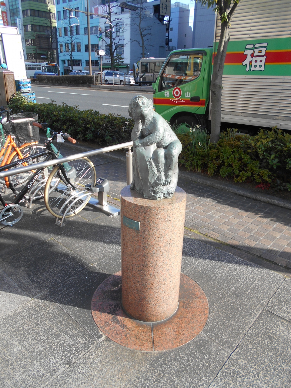 JR岡山駅の駅前には桃太郎伝説の銅像があり、岡山城や後楽園に向かう途中にも伝説にちなんだ像があります。駅前の像は大きくて周辺は座ることができるので待ち合わせに使われているようです。通りの像は小さい物ですがなかなかユニークなデザインです。