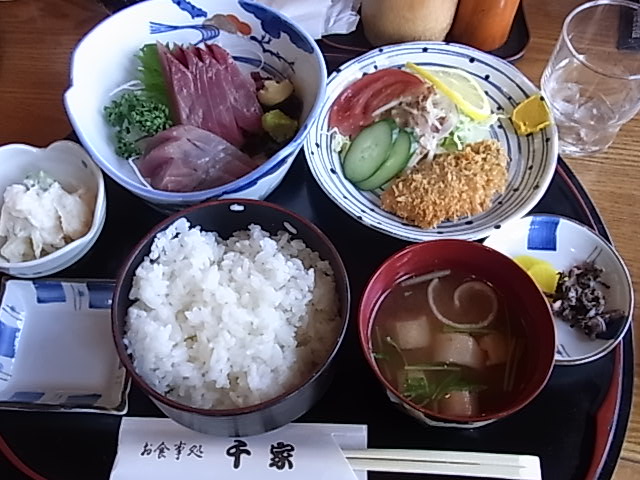 私は旬のカツオの刺身とアジフライがついた定食を取りました。カツオは背身と腹身の2種入っておりなめらかでトロッとした食感がよく、食べたことのない美味しさでした。フライも熱くカリッとしてました。