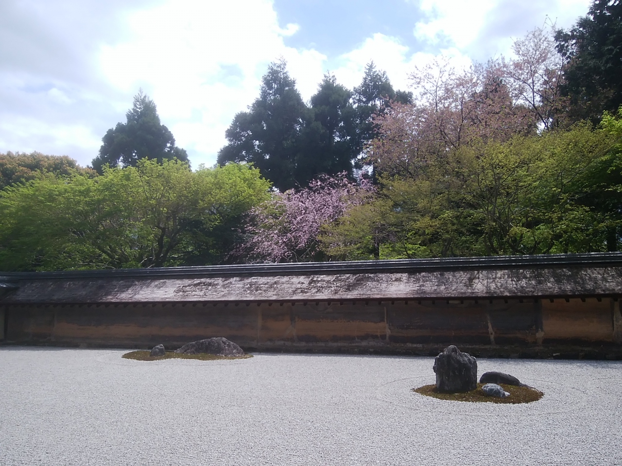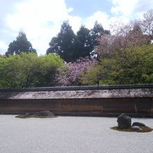 遅咲きの桜を求めて…。京都の桜情報サイトで桜の名所として龍安寺の石庭の塀越しに枝垂れ桜が楽しめる…と書いてあり、訪れてみました。
