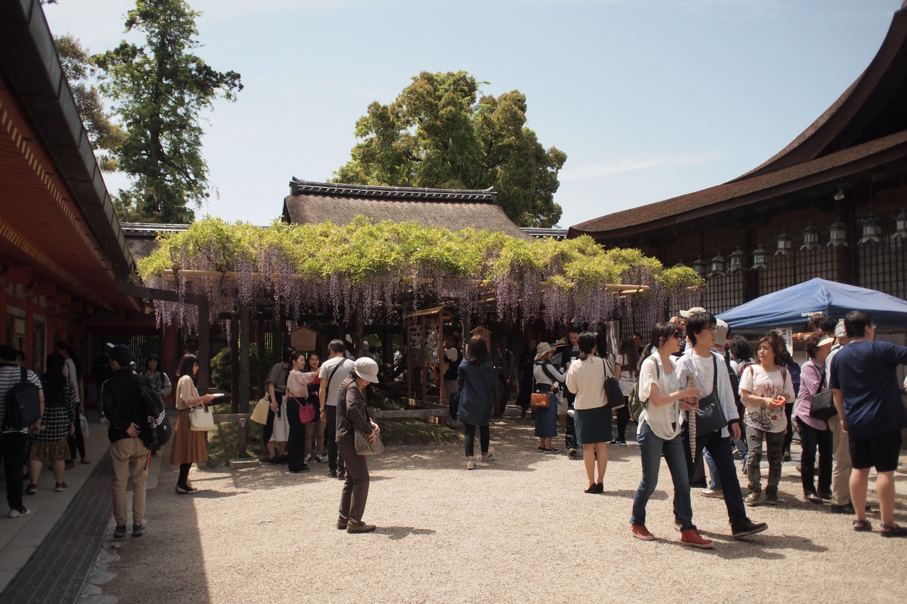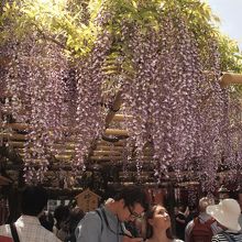 見応えのある藤です。開花時期はゴールデンウイークと重なることが多く藤棚の下は満員電車状態です。「砂ズリ」は地面に届くほどという意味でしょうが花房の長さはそうでもありませんでした。万葉植物園に行く時間がなければここで藤を楽しみましょう。