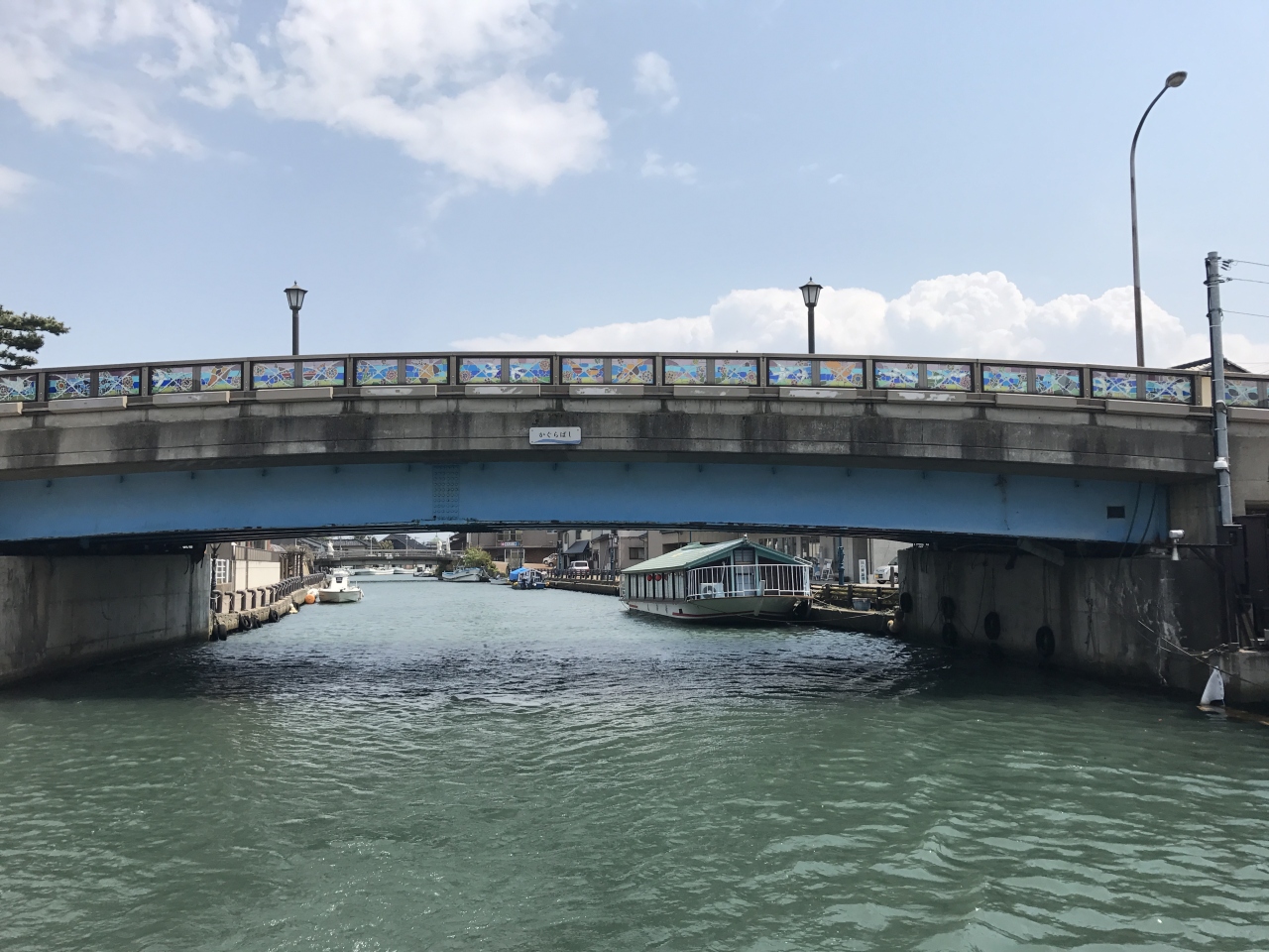 内川にかかる橋の一つで遊覧船から眺めました。欄干にキラキラしているものがあるなと思っていたらステンドグラスでした。なんともオシャレな橋ですね。晴れていたので太陽に反射して余計に輝いていました。地元出身の工芸作家さんが72枚ものステンドグラスをうめこんだそうです。