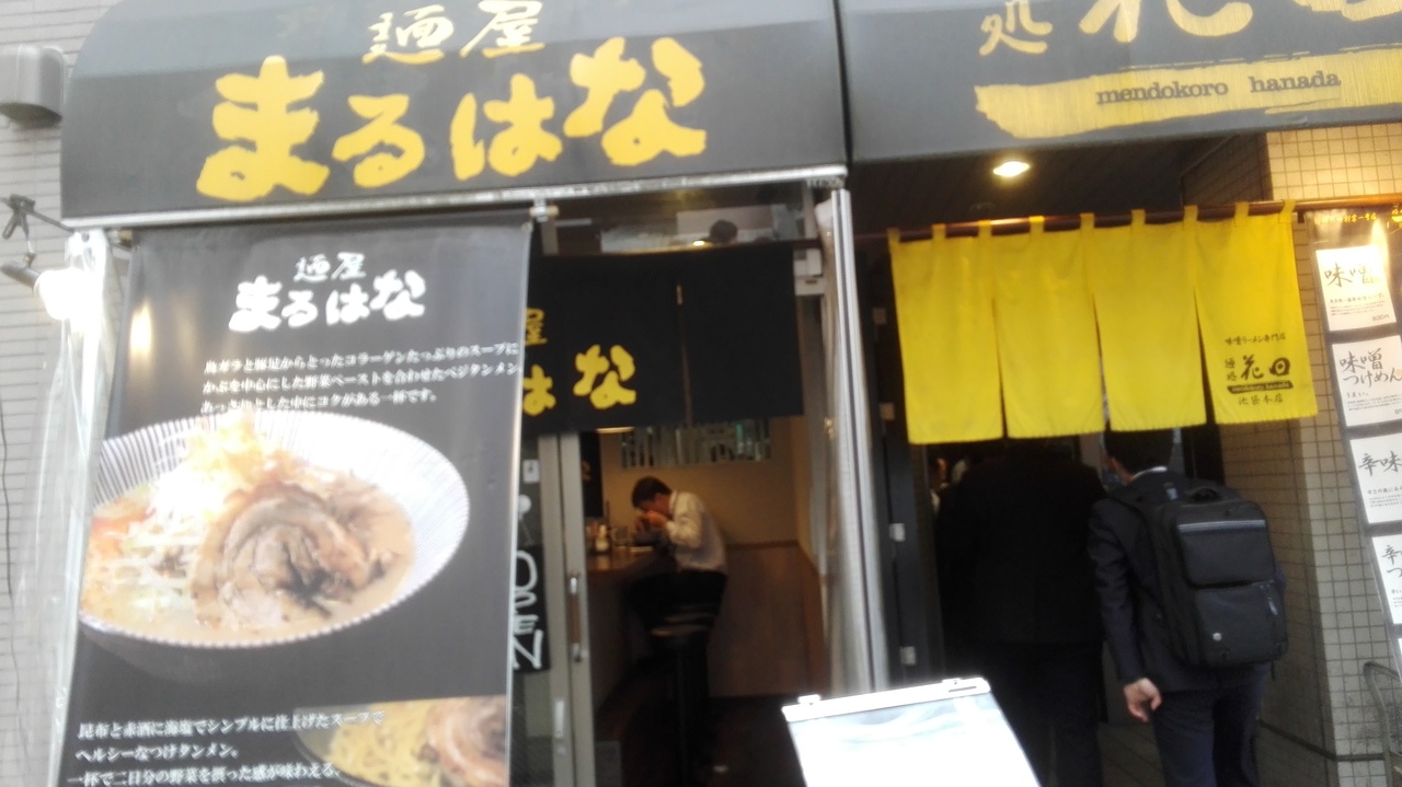 以前から行列のできているラーメン屋さん、花田が、サンシャインの裏で気になっていたので、昼下がりに行ってみたら。。店外まで行列は伸びていないけど、満席で少し待っている人がいる・・待つのは嫌。で、同じような黄色い店が隣にあり、店名は違って「まるはな」ですが、カウンターがこじんまりと、上品なお一人様客がちらほら、なので入って見ました。一番安いラーメンの800円の食券を入り口の券売機で買います。カウンター席につくと、ご飯要りますか?紙エプロン要りますか?と聞いてくる。最初、ご飯は断ったけど、白いご飯じゃなくてミンチ肉がトッピングされているので頼んでみたら、鶏肉ラーメン味そぼろ、って感じで食べやすい。紙エプロンもお願いしました。で、一番シンプルなラーメンですが、こってりしているけど、魚介系の味はしない、(よかった、魚介系はとても苦手、な時があります)。かなり太い麺です。お野菜がたっぷり入っていてボリュームがある。チャーシューは脂っこくなくて厚切り、パサパサしないよいお味。途中であきっぱい私は量が多いので困ってしまったけど、ほとんど完食。こってりして、太麺だったのに、胃もたれしません。花田、や近くの鬼金棒、は行列でなかなか入れませんが、花田系列のまるはな、よいです。途中から入ってきた客も上品。よいラーメン屋さんです。女性1人でもOK。
