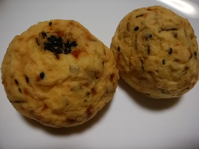 買ったのは…梅がんも、カレーがんもの2つです。どちらの1つ180円(税込)でした。ぷっくり厚みのあるがんも。まず電子レンジでチンして中まで温めてから、軽くトースターで表面をさっくりと焼いて頂きました。