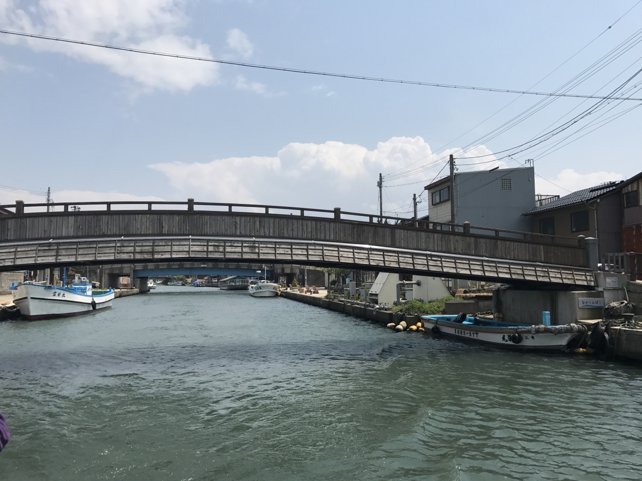 内川を遊覧船でめぐっていたら、やけに風情のある橋が前方に見えてきました。木製の欄干で和の雰囲気があって、日本らしい橋というか。江戸時代の日本橋を思わせるような、そんな感じがして、とても見ごたえがありました。北前船をイメージしているとのこと。