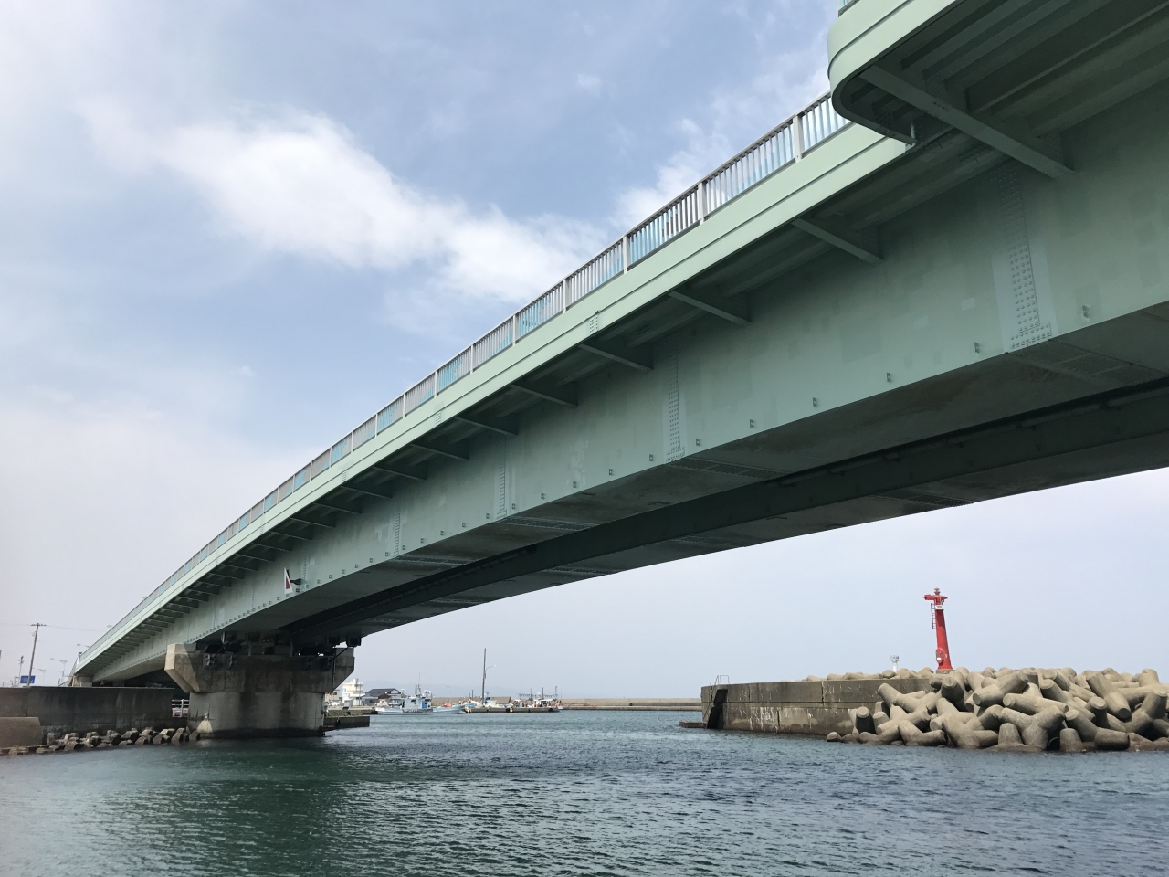 遊覧船で内川めぐりをすると、一番最後にくぐる橋です。この橋をくぐると海へ出るという感じです。ガイドさんによると、橋の上からの景色もよく、天気がよければ立山連峰が一望できるとのこと。かなり大きな橋で、船から見ても迫力がありました。