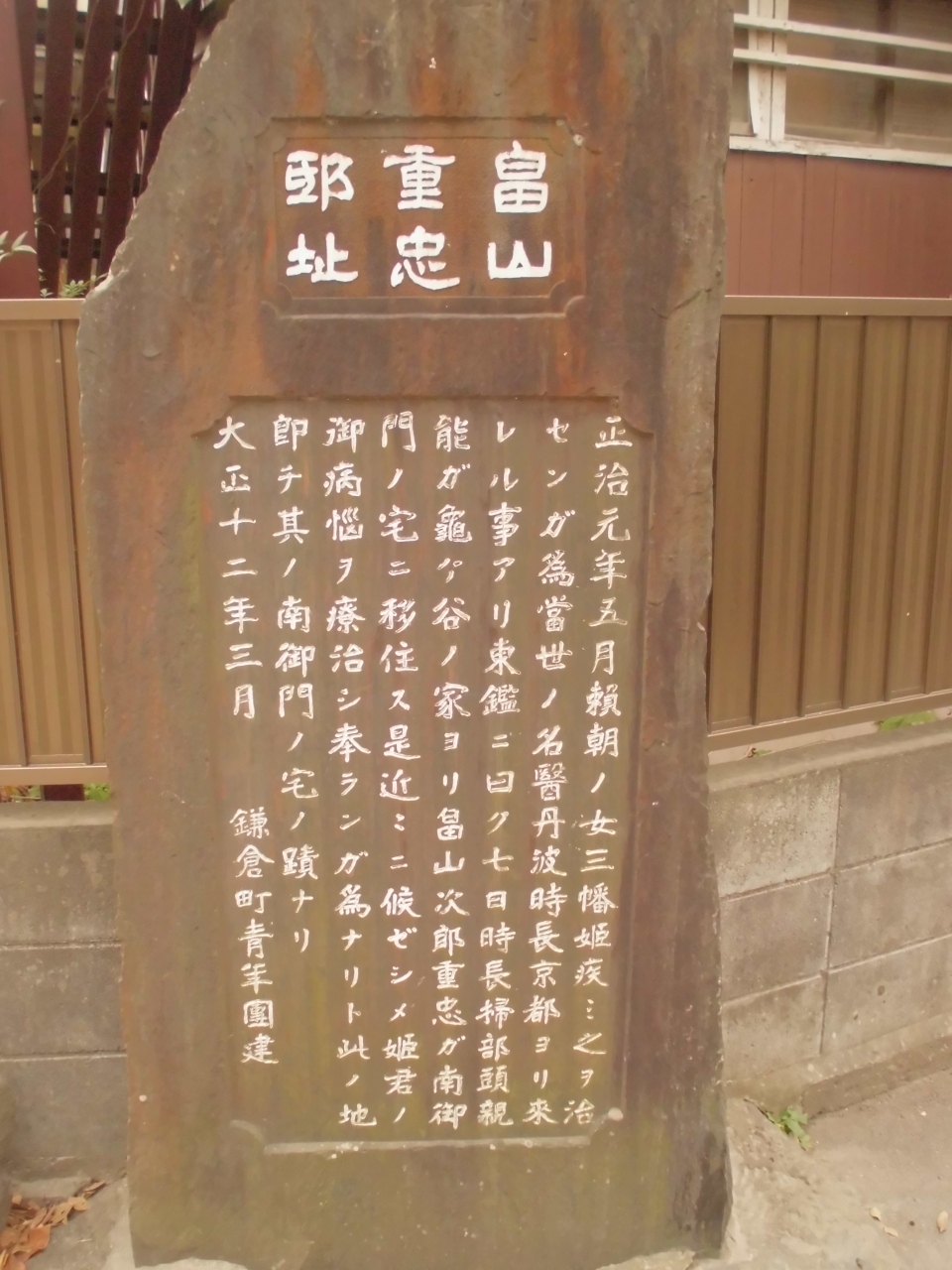 鶴岡八幡宮の東にあります。畠山重忠とは頼朝の家臣で重要な存在だったそうです。鶴岡八幡宮の近くに家があったのだから確かにそうなのでしょう。今までこの人を知らなかったのですが、この石碑のおかげでその存在を知ることができました。