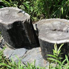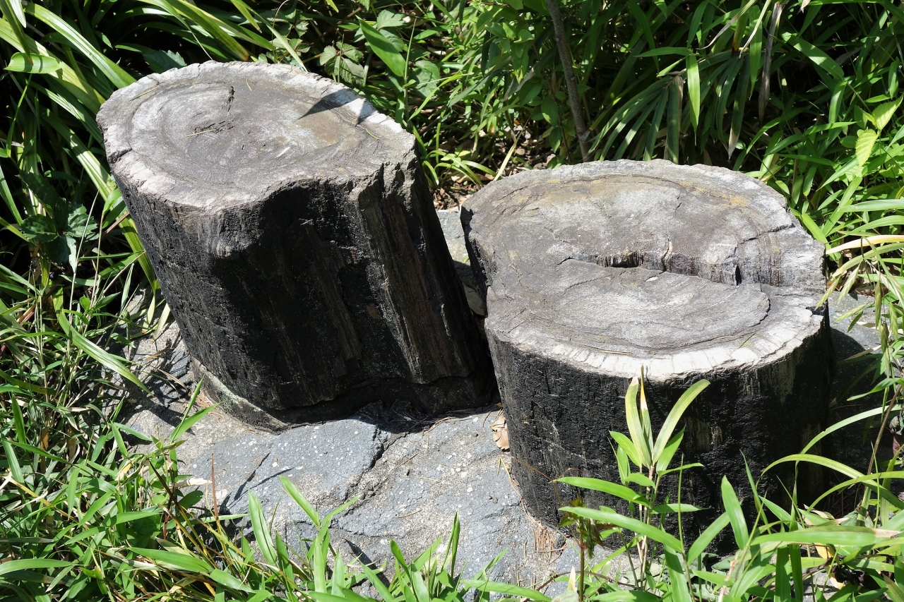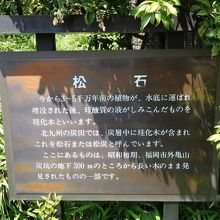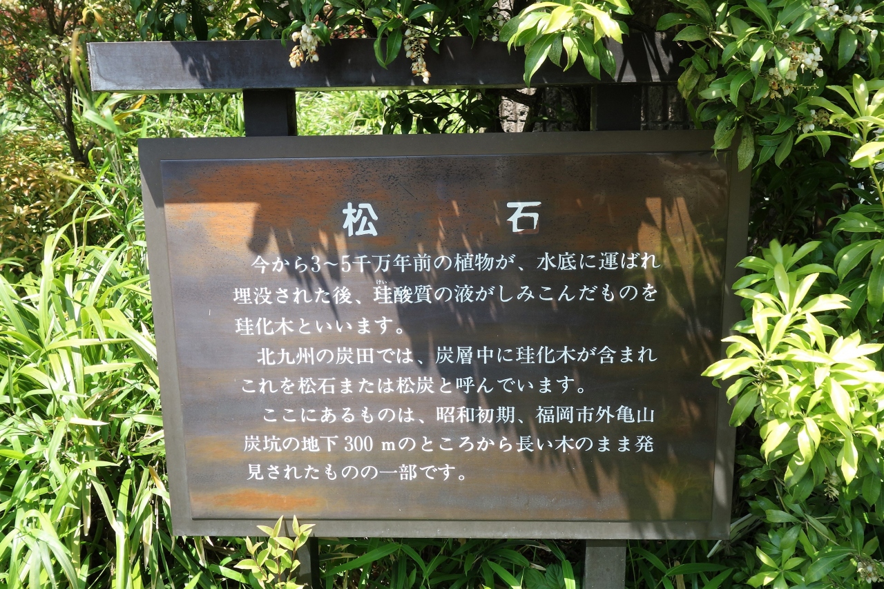 目立ちません。説明板が在っても、それにすら目を留めません。植込みの傍らにひっそりと置かれています。近寄ってみても人工物か或いは全く普通の木の切り株にしか見えません。福岡県の炭坑から発見されたそうですが、言われなければ化石とは思いません。