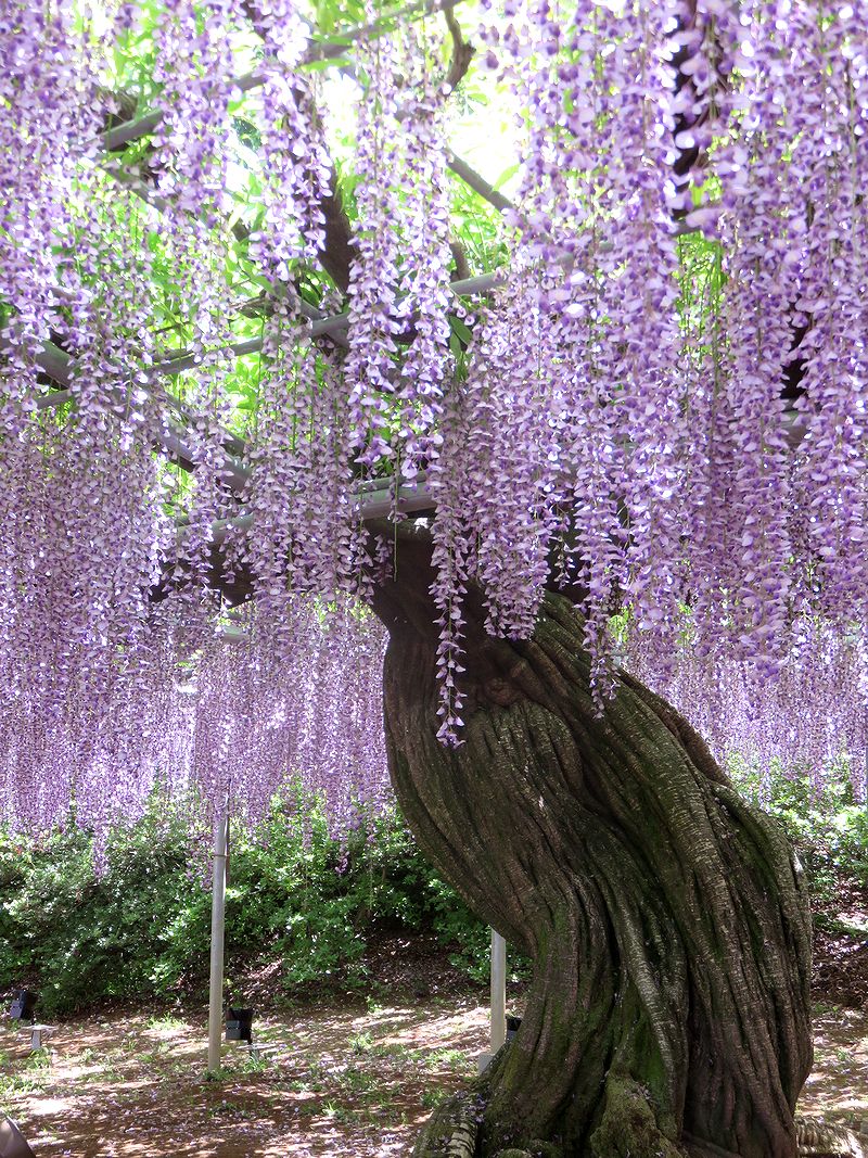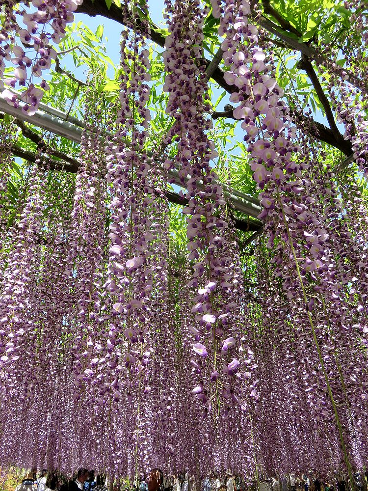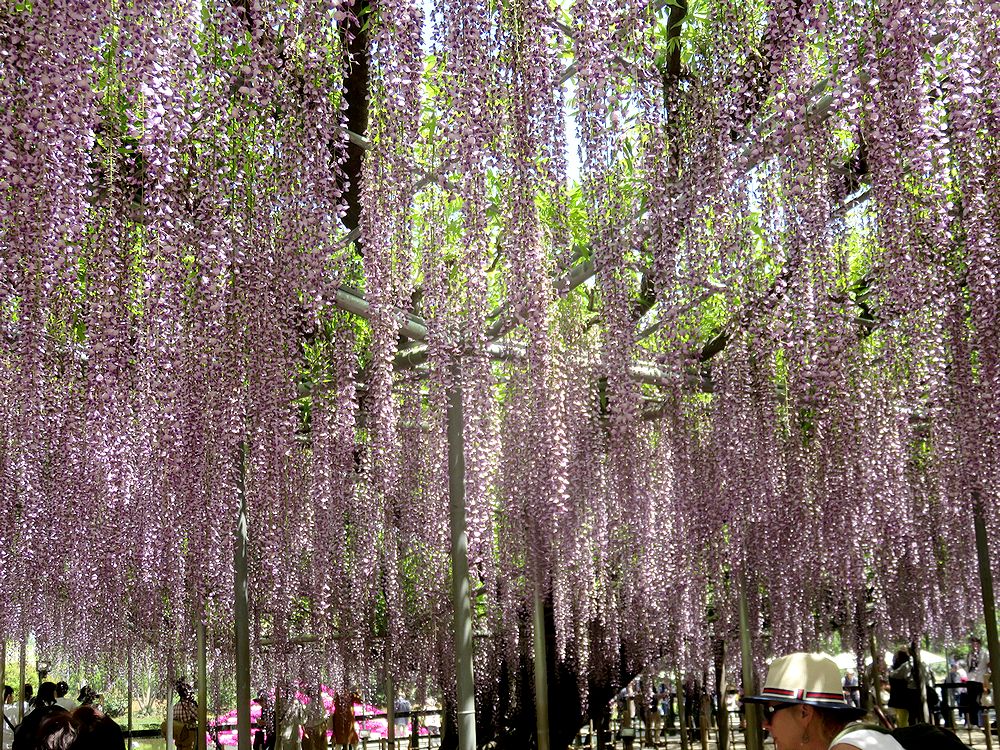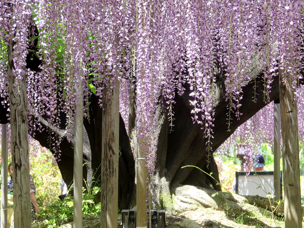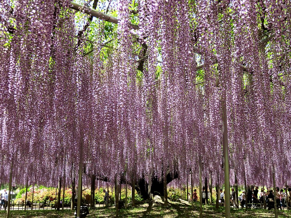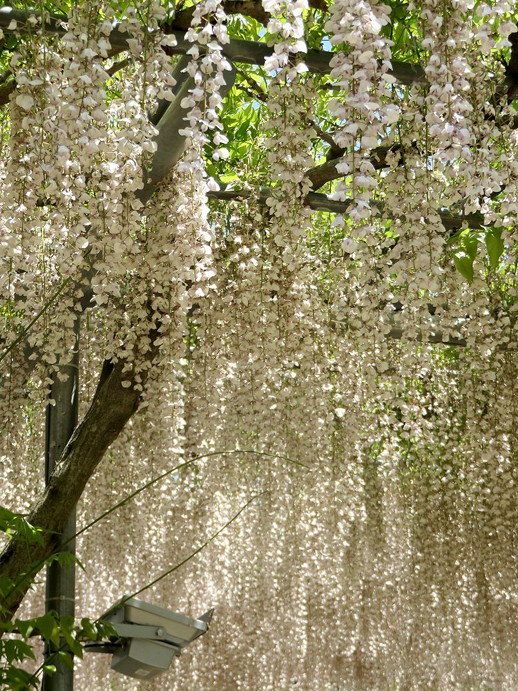 ひたち海浜公園のネモフィラを見た翌日に、大洗を8時半に出発して東京に戻る途中で立ち寄りました。公園入り口近くで少し渋滞にあいましたが、がらがらの臨時駐車場に駐車でき、10時ちょっと過ぎに入園できました。公園までのアクセス道路は右折が2カ所あり、渋滞が発生しやすい道路状態に加え、臨時駐車場への積極的な誘導もなく、係り員どうしの連絡がうまくとれていないように感じました。他の方の口コミにも書かれていましたが、混雑時は最初から臨時駐車場を目指した方がいいと思います。公園の中は混んではいたのですが、平日ということで比較的スムーズに見て周り、花の撮影には支障がありませんでした。大藤が一本あるだけかと思ってきていたので、数多くの藤に驚きました。この時期つつじは終わりに近かったのですが、藤の他に、シャクナゲ、クレマチス、デルフィニウム、ルピナスなどは見ごろを迎えていて、どれも見ごろで美しかったです。キバナ藤だけはまだ3分咲きくらいだったことが残念でなりません。