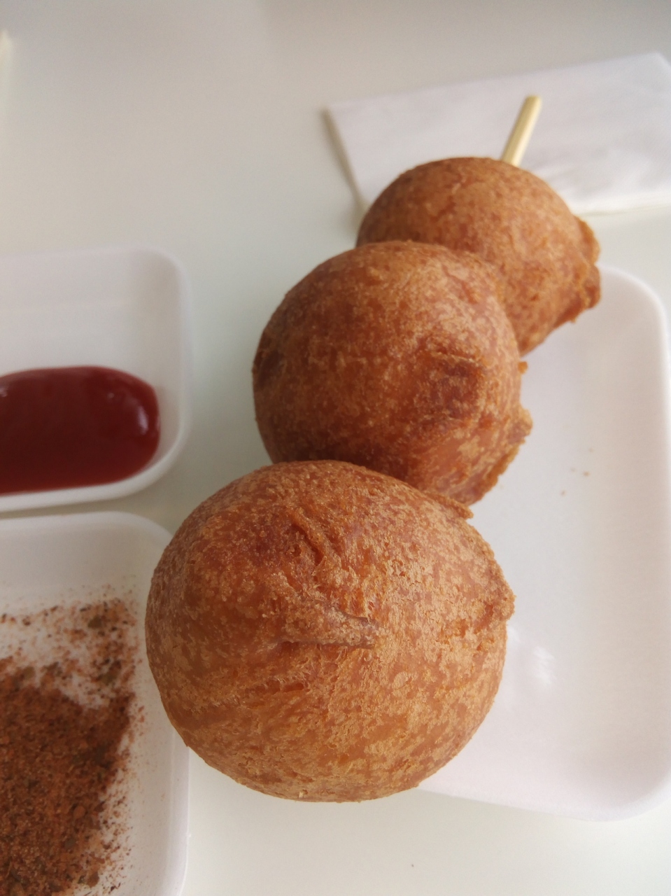 購入後は、入り口付近で好きに味付けします。ケチャップからマヨネーズ、スパイシーな調味料など沢山の種類が用意されていて、好きな味付けで食べられます。個人的には甘味にしたいので、砂糖があれば嬉しかったのですが…