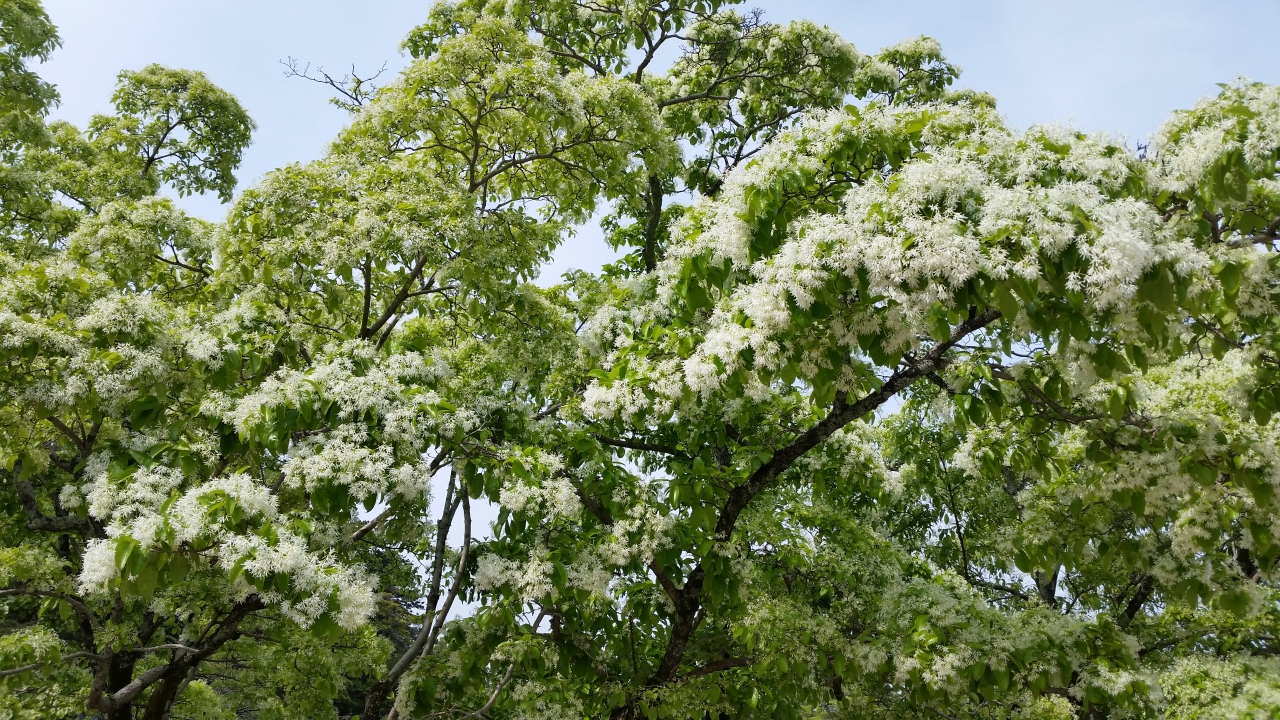 ゴールデンウィーク時期には公園内の通称「ナンジャモンジャノ木」に白い花が咲き始めていました。