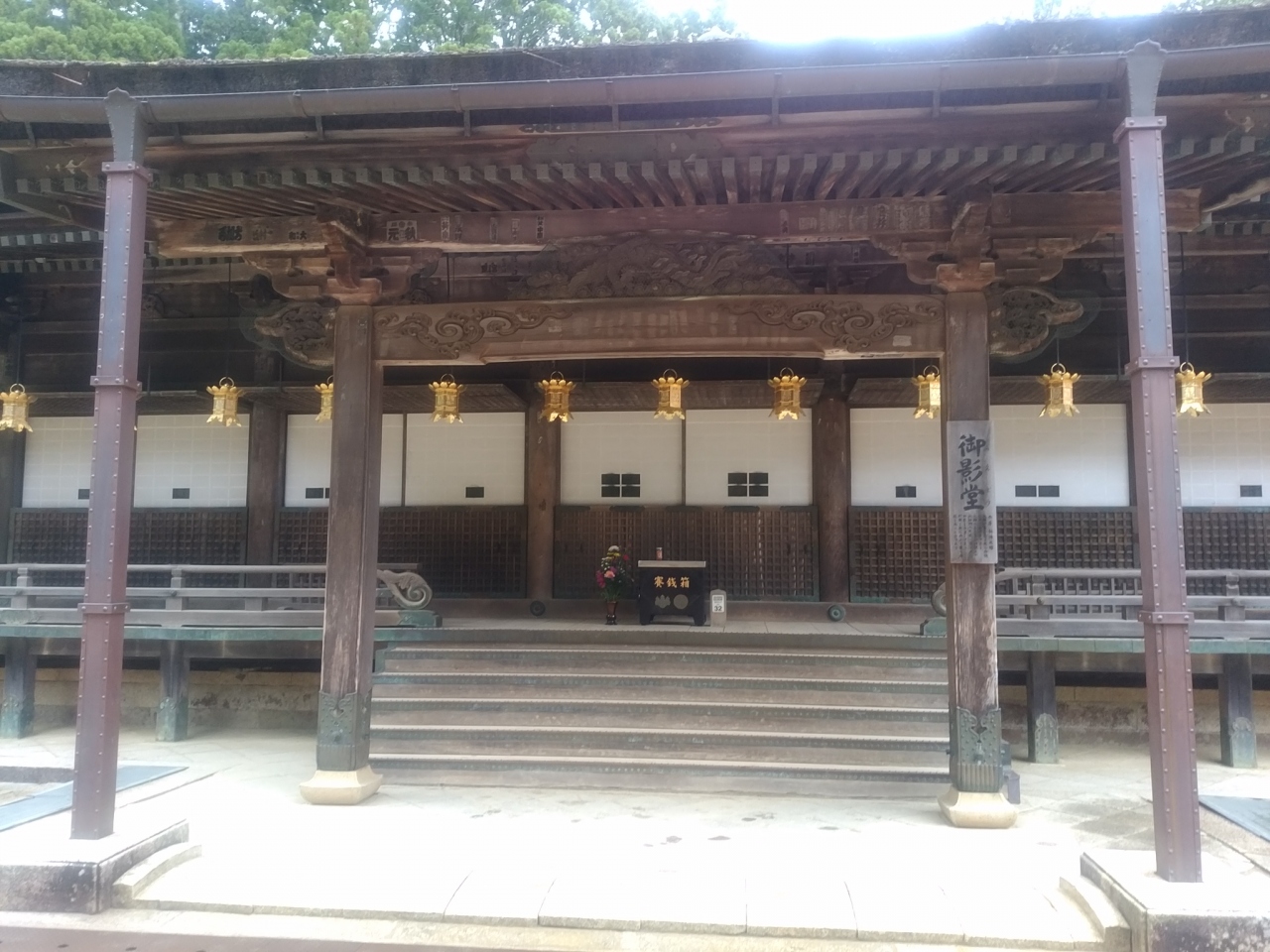 壇上伽藍の金堂裏にあり、弘法大師の持仏堂とされる建物でしたが、のちに大師の弟子で真如新王直筆の「弘法大師御影像」を泰安したことから名付けられたそうです。高野山でも御廟と共に最重要な聖域とされ限られた人しか入る事が出来ないそうですが、3月21日の「旧御影供」の前夜御逮夜法会の後に外陣へり一般参拝が許されるそうで、外陣には弘法大師の十大弟子像が掲げられているそうですが、一見すると昔の古い単なるお堂にしか見えませんか、お堂周囲にぶら下げてある金の燈籠と思われるものは綺麗でした。