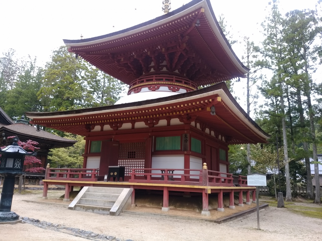 壇上伽藍の中にある東搭は後白河法皇の発願で京都の醍醐三宝院の勝覚の手により造営された二重搭です。天保14年の高野山大火災で焼失し昭和59年の「弘法大師御入定150年御遠忌記念」の記念事業として再建されたそうで、割と新しく朱塗りで綺麗でした。本尊は「尊勝仏頂尊」で脇侍として両脇に「不動明王」と「降三世明王」がお祀りされているそうです。が降三世明王は聞いたことがあのそうで無さそうですが、インドヒンドゥ教の最高神「シバ神」とその妻である「パールヴァティー」だそうです。若い頃に読んだ漫画に出てきた名前と同じ事を思い出しました。高野山色々な神やインドの神まで非常に面白く興味が尽きない地となりそうです。