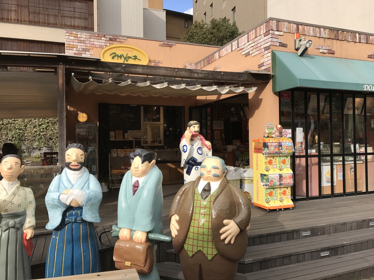 道後温泉本館横にある、半露天屋のお土産&オープンカフェ屋さんです。 色々なカカオ豆のチョコレートの販売もしています。カカオの勉強になります。店のタイトルが「みかんの木」との繋がりはわかりませんが、地ビールなど地元の物も売っています。店の前には、坊っちゃん、山嵐、太鼓持ち、マドンナ、タヌキ、赤シャツなど、坊っちゃん小説の主人公のイメージ像がありフォトスポットにもなっています。