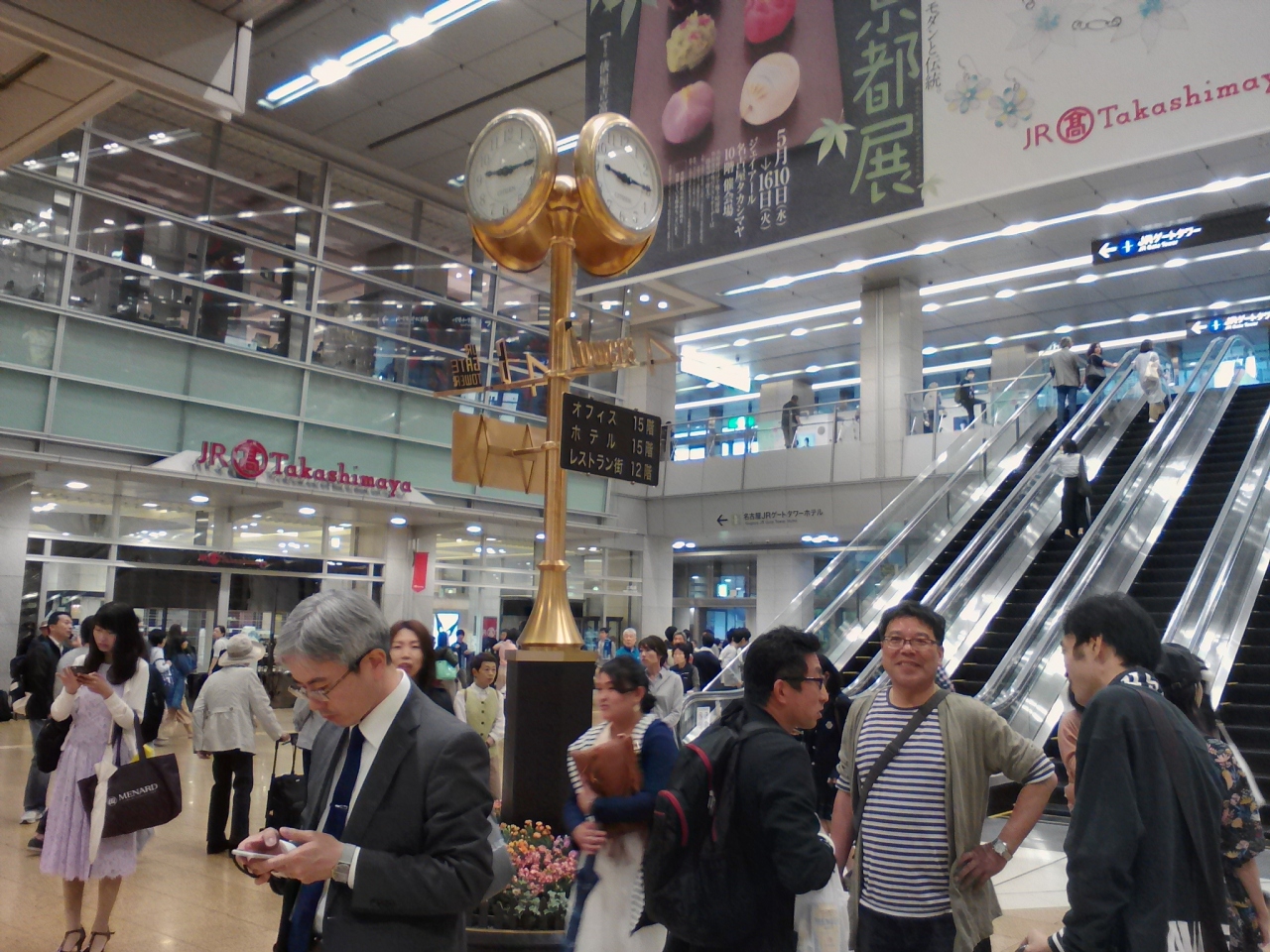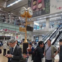 JR名古屋駅中央コンコース桜通口にある時計塔です。文字通り金ピカに光っています。 JR高島屋の前、JRセントラルタワーズへ上がるエスカレーターのど真ん前にありとてもわかりやすい場所にあります。待ち合わせポイントなっており常に多くの人が集まっています。