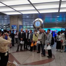 JR名古屋駅中央コンコースの太閤通口(たいこうどおりぐち)にある時計塔です。新幹線の改札のちょうど前にあるので待ち合わせ場所として使う人が多いです。しかしちょっと注意…、中央コンコース反対側の桜通口(さくらどおりぐち)には金ピカに輝く「金の時計」なるものもあります。待ち合わせで使用する時には“金”なのか“銀”なのかをしっかり確認した方がいいと思います。