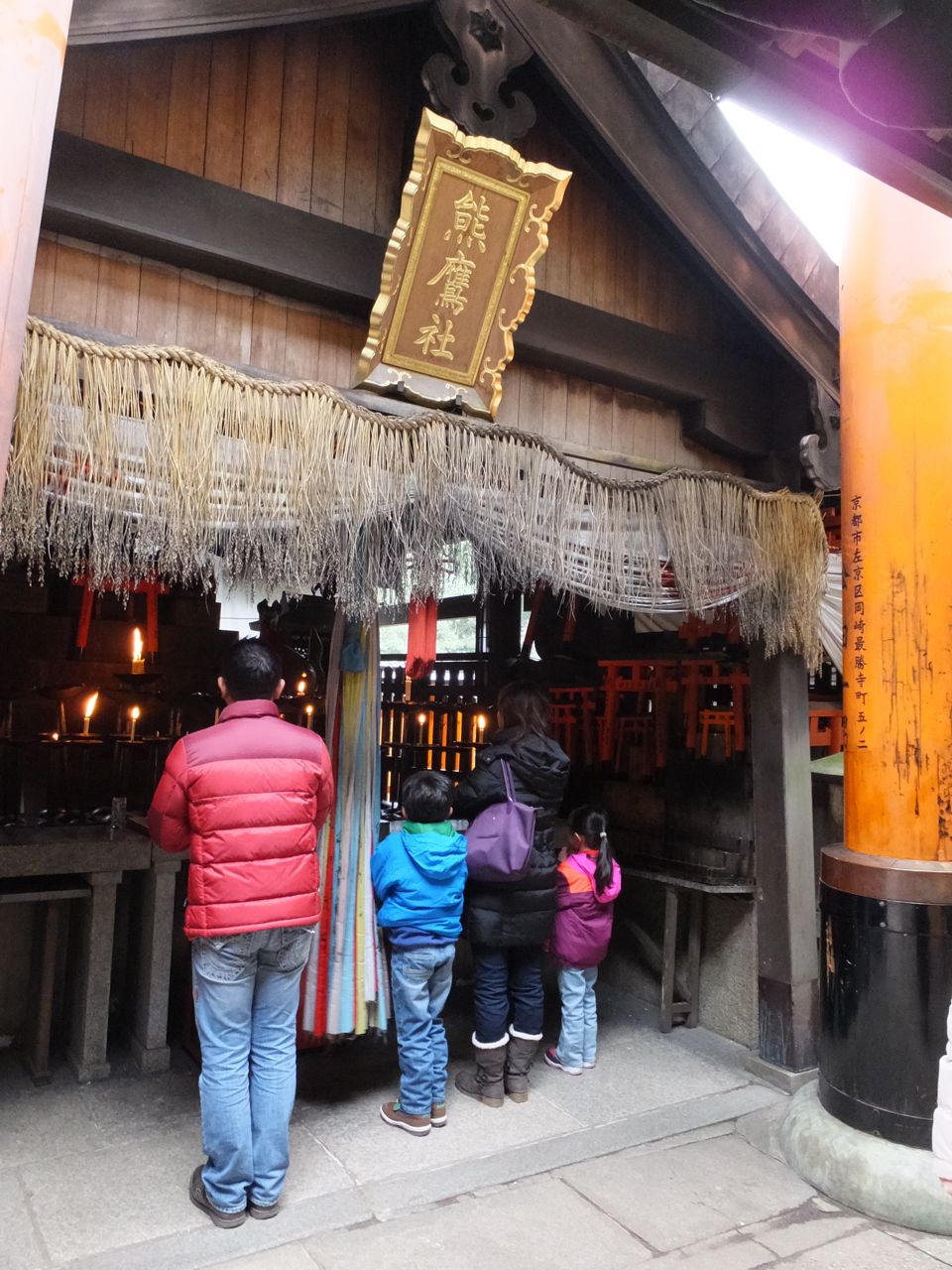 伏見稲荷の千本鳥居。全部まわると3時間はかかると言われ、このあたりで、と決めたのがこの熊鷹社。いさましい名前ですが本当に小さなお社でした。こんな山奥に池が?という場所にあり、行方知れずの人を探すときに池に向かって手をたたいたときにこだまの帰ってきた方向に手がかりがあるとのこと。熱心にお参りしている人を見ると、いろいろなことをかかえながら神社にお参りする人の心を感じました。