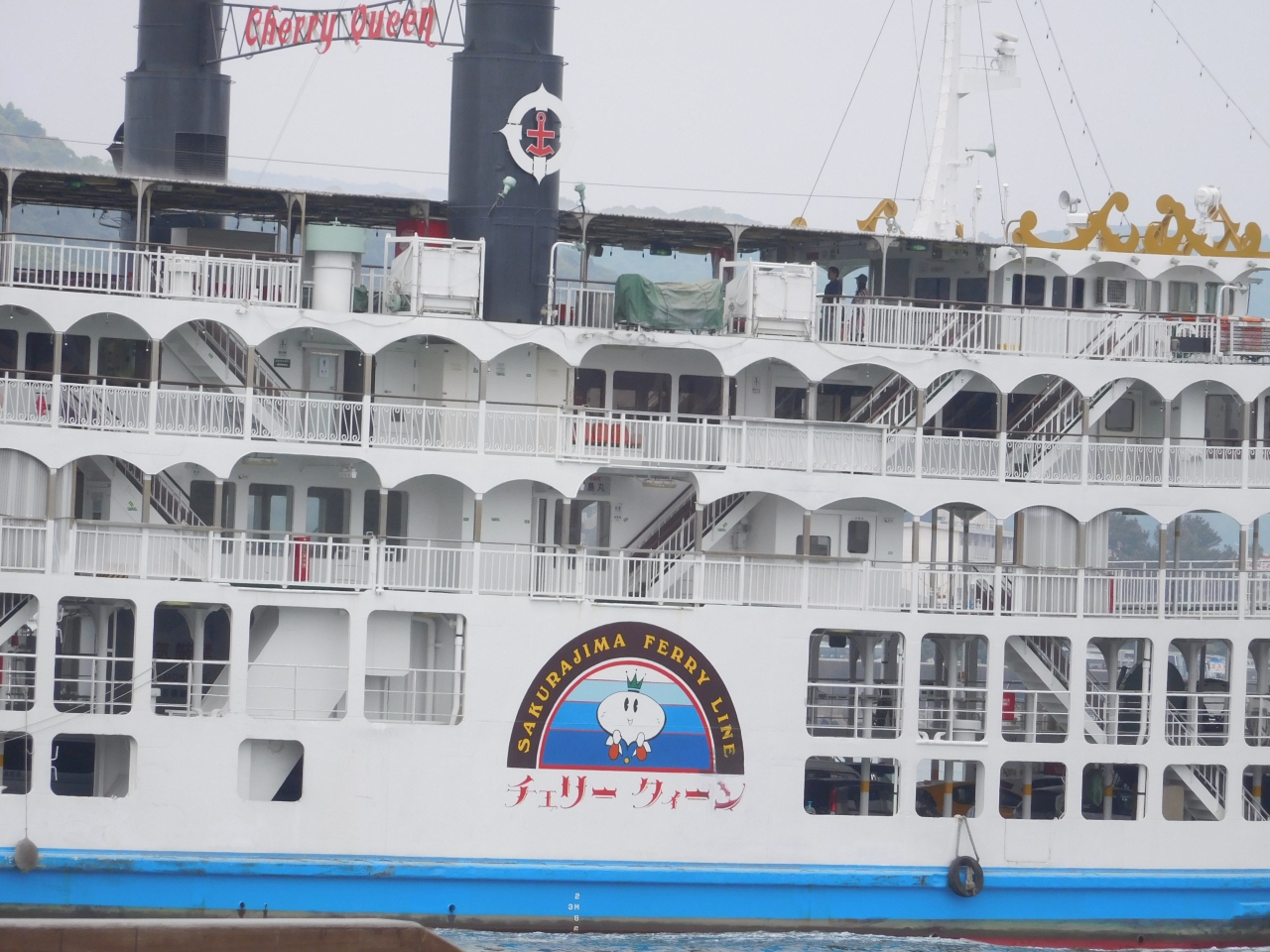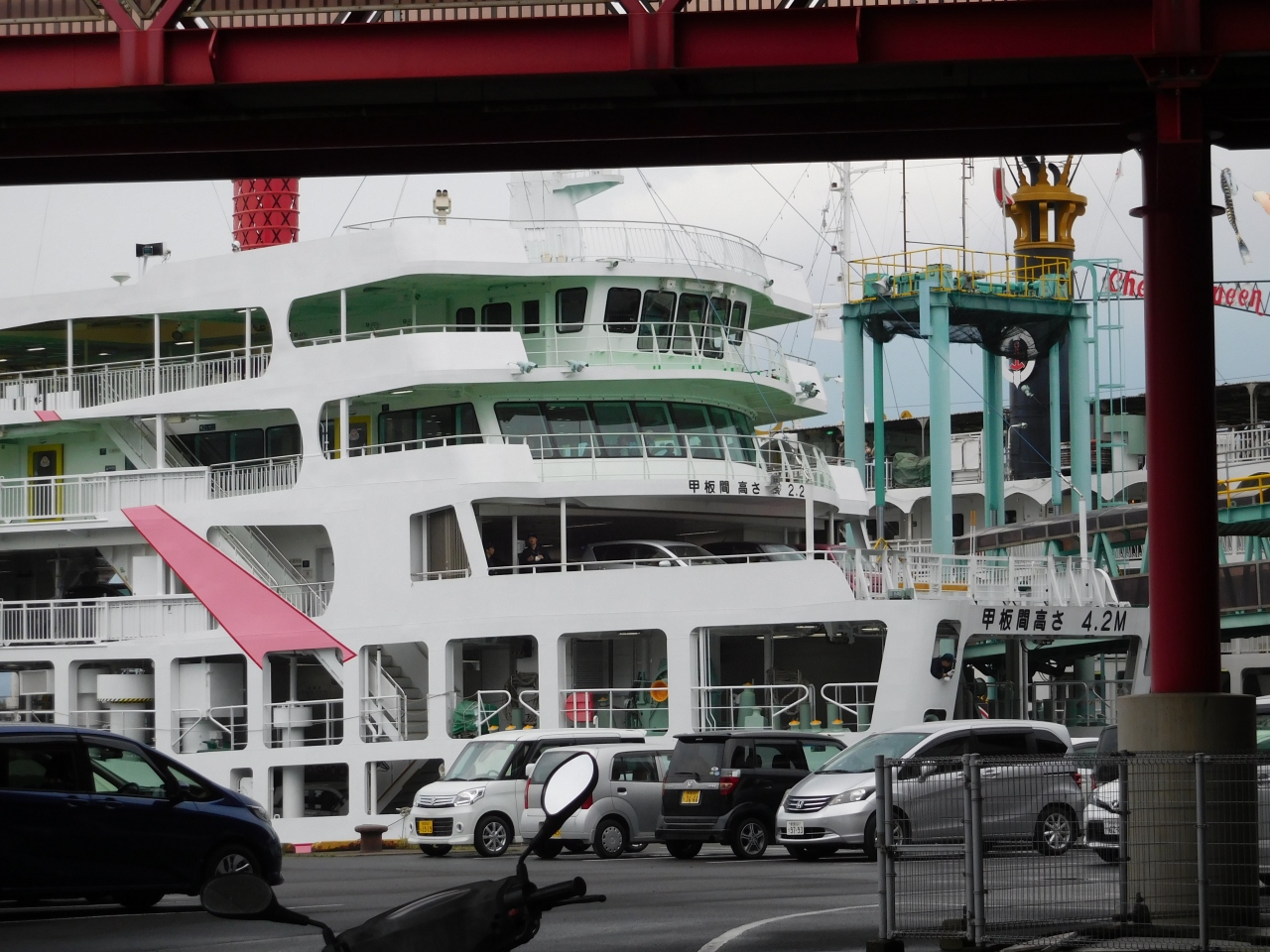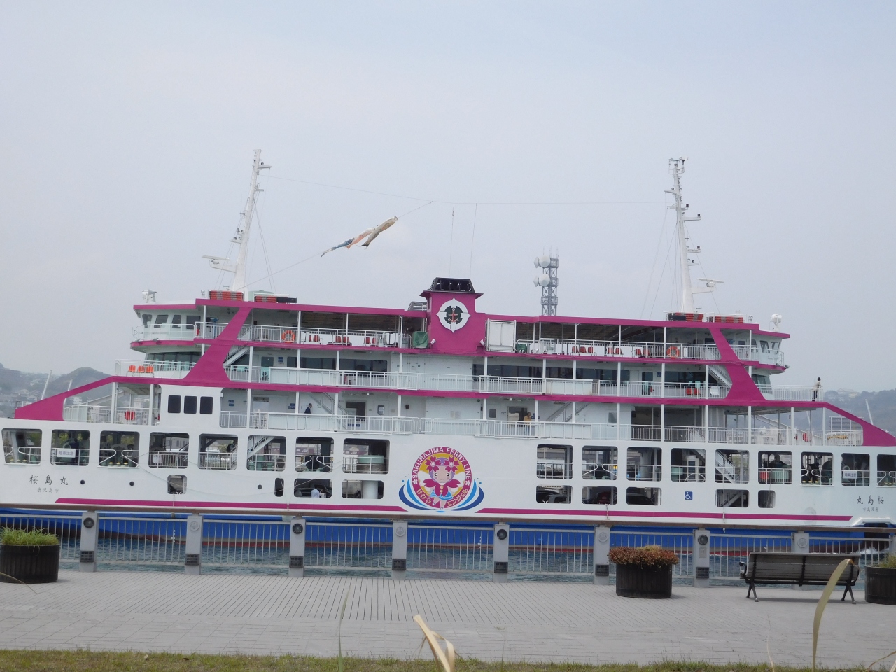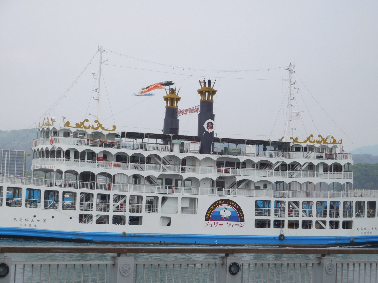 かごしま水族館近くの「鹿児島港」と、「桜島港」を、約15分で結ぶフェリーです。日中は、15分おきに運航していて、料金も利用しやすい金額で利用出来るので、とても便利です。今回は、鹿児島港から桜島港の片道を車で利用しました。フェリー乗り場の案内に沿って、乗船を待ち、係員の誘導に従って、手際よく駐車して行きました。車輪止めをし、車のエンジンを切った後は、そのまま車内に残っていても、客室に上がる事も出来ます。桜島に向かって、まっすぐ進んで行くので、どんどん桜島が近づいていく様子は迫力がありました。料金の支払いは、桜島港側のみとなり、高速道路の料金所のようなゲートで、支払いをしてから、桜島側に入りました。船はほとんど揺れず、あっという間に到着しました。また、季節柄、どの船の上にも、鯉のぼりが泳いでいました。陸側からフェリーを眺めるのであれば、かごしま水族館の裏がおススメです。