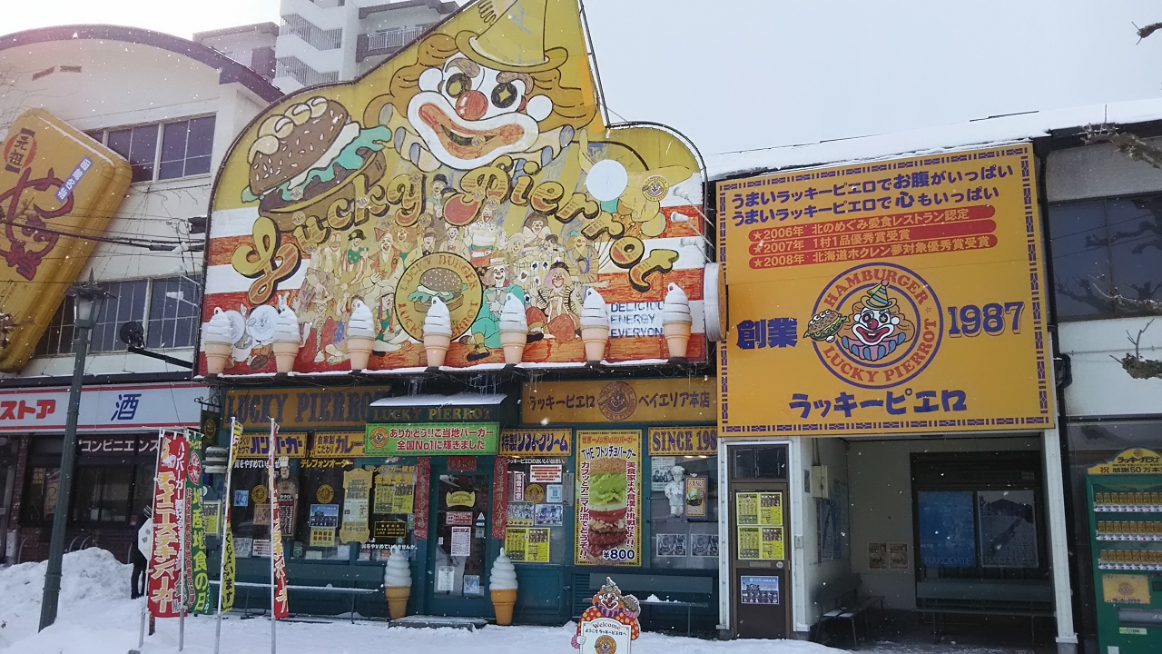函館でハンバーガーと言えば、ラッキーピエロしかないでしょう。他のハンバーガーがあっても、わざわざ食べる必要もないくらいお店が市内に沢山あります。そしてメニューの多彩さも、店内の雰囲気も個性的。このベイエリア本店では、ブランコの席で食べたいと待っている人もいるくらいでした。