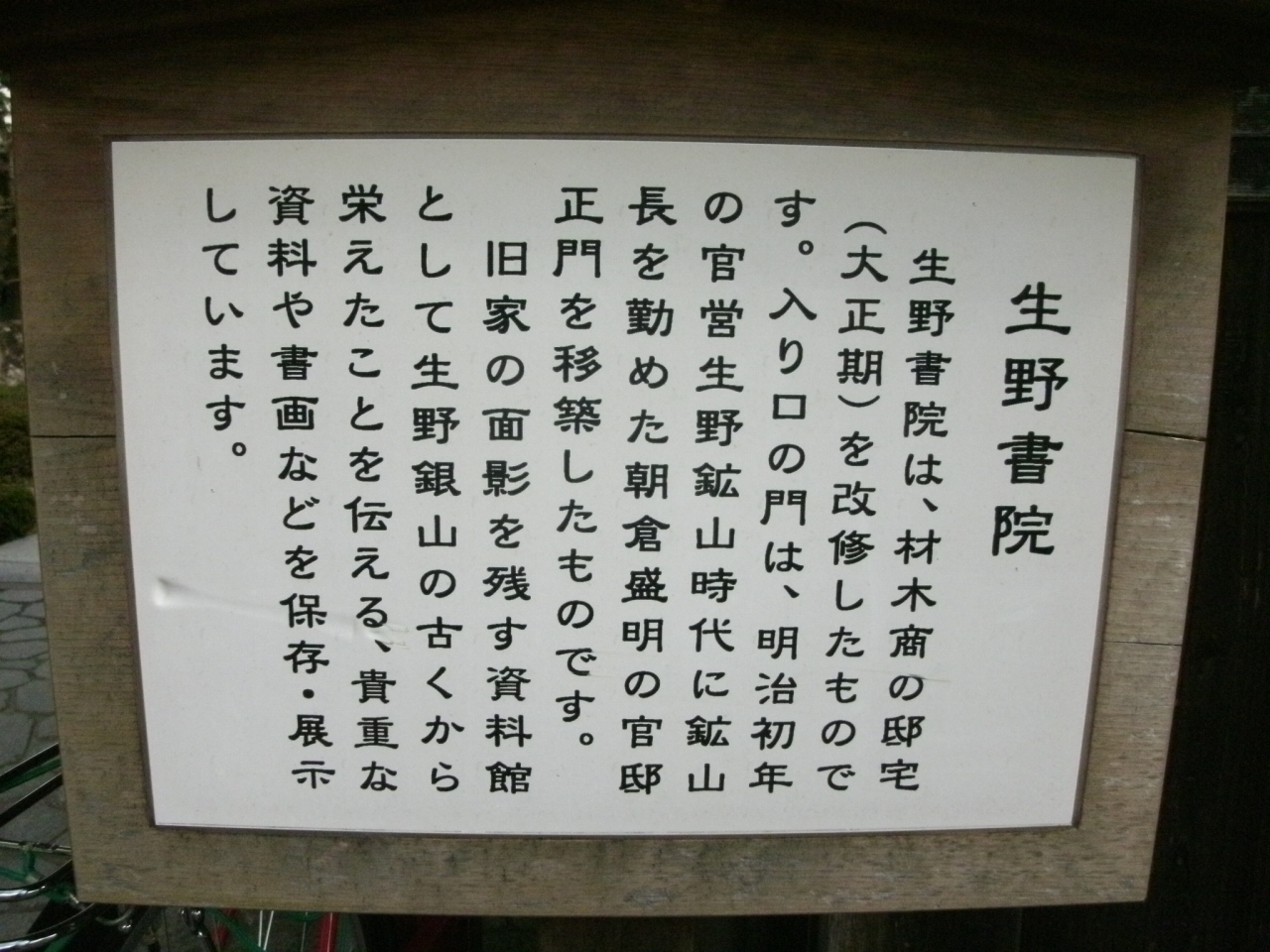 現地にある説明板によると、大正時代に建てられた林木商の邸宅を改修して資料館にしたものだそうで、大きくて立派な造りや広い庭に旧家の面影を見ることができます。展示室には、生野銀山の歴史を伝える古い地図や絵、鉱山にまつわる古文書、江戸時代に使われていた掘削の道具や秤などが展示されていました。入館料は無料なので生野の町を散策時に是非立ち寄られると良いでしょう。なお、館内は撮影禁止になっています。