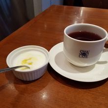 美しい前菜、ドリンク(ハーブティーにしましたがコーヒーやジュース等選べます)、デザート(ヨーグルト)がつきます。