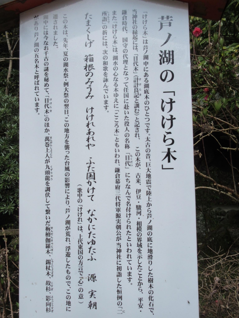 説明板によると芦ノ湖の湖底木の化石らしい。展示(?)の木は台風の影響により浮遊してきたもので、芦ノ湖五名木のひとつ。みたところ化石のようには思えないけれど、樹齢は感じました。