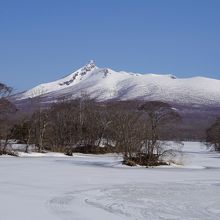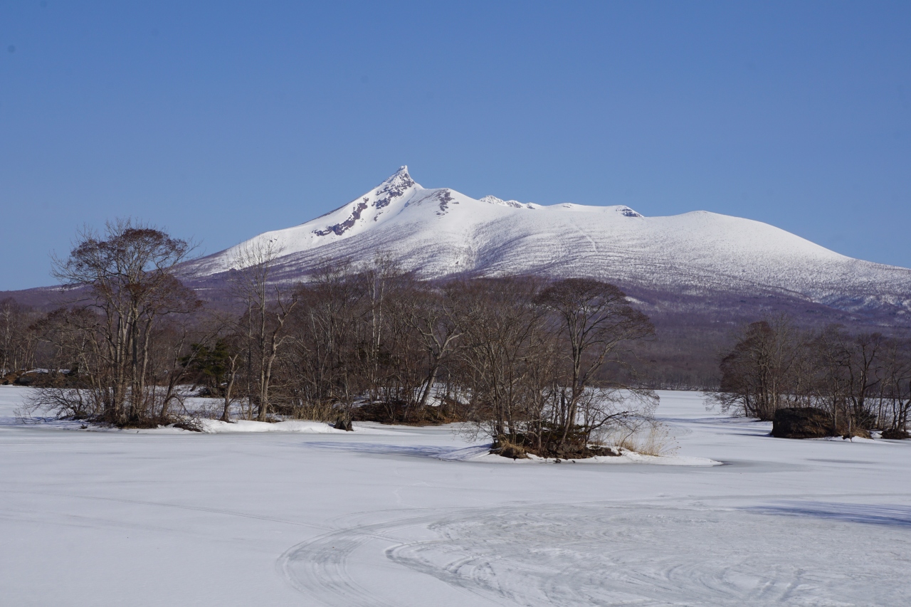 北海道駒ヶ岳は、大沼公園のバックにそびえる山で、まさに大沼公園のシンボル。3月でまだ湖面は凍って雪に覆われていたので、余計に、駒ヶ岳の美しさが目立っていたように思います。つんと上を向いたような山頂の形と馬の背のような山すそへの稜線は少し見る角度を変えただけでも変化があって、それも魅力の一つかなと思います。