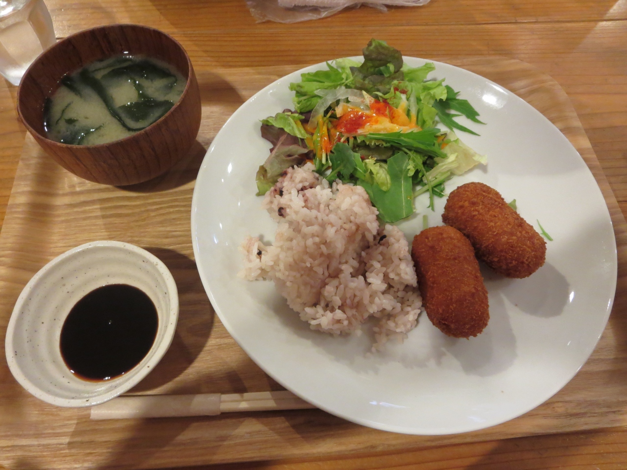 私が食べた時は、コロッケ、五穀米、ベビーリーフなどのサラダ、お味噌汁でした。