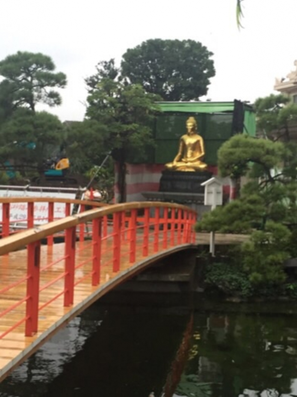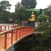 川崎大師の日本庭園の部分にあるやすらぎ橋を渡った先にある仏像ではありますが、全身金ぴかで非常に目立つ存在です。