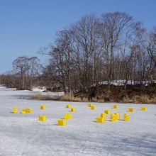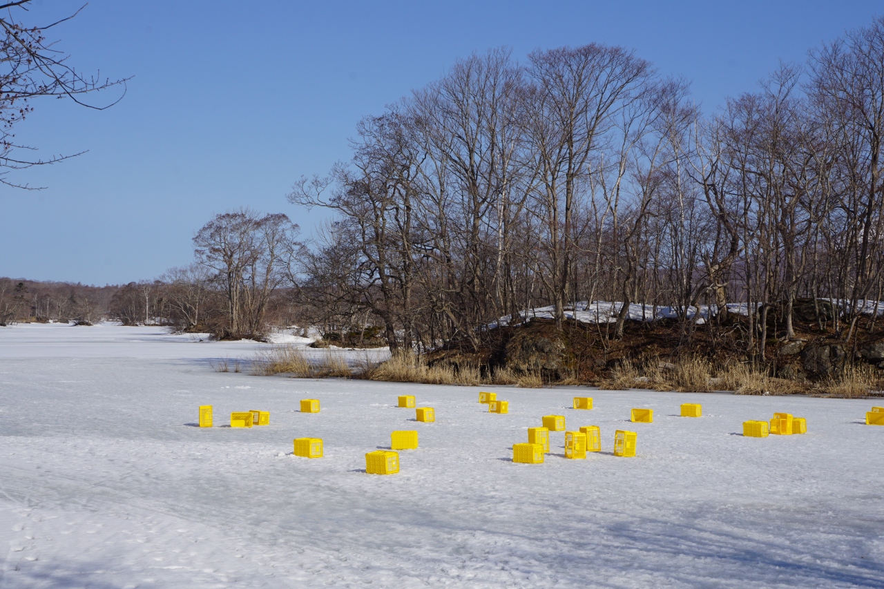 一方で、コースからすぐの氷の張った一面真っ白な湖上には黄色いビールのケースのようなものが散乱している。変だなあと思ったら、これはシラサギ釣りのためのもの。ここに腰かけて釣りをするんですね。朝早かったのでまだ一人も釣っている人はいませんでしたが、お店の方ではもうスタンバイしている感じ。冬のシラサギ釣りがこんなに手軽な場所でできるなんて初めて知りました。