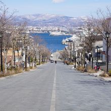 函館山のすそ野から函館湾に向かってはいくつも坂があって、函館の名物になっているのですが、一番有名なのは八幡坂でしょう。道幅も広いし、湾の向こうの摩周丸までが一直線になって見通せる。もうかなり昔になってしまいましたが、チャーミーグリーンの宣伝のインパクトが今でも生きているような。その宣伝は知らないような若い人も含めて大勢の観光客が坂の上から写真を撮っていて、ひと際人気の坂となっています。