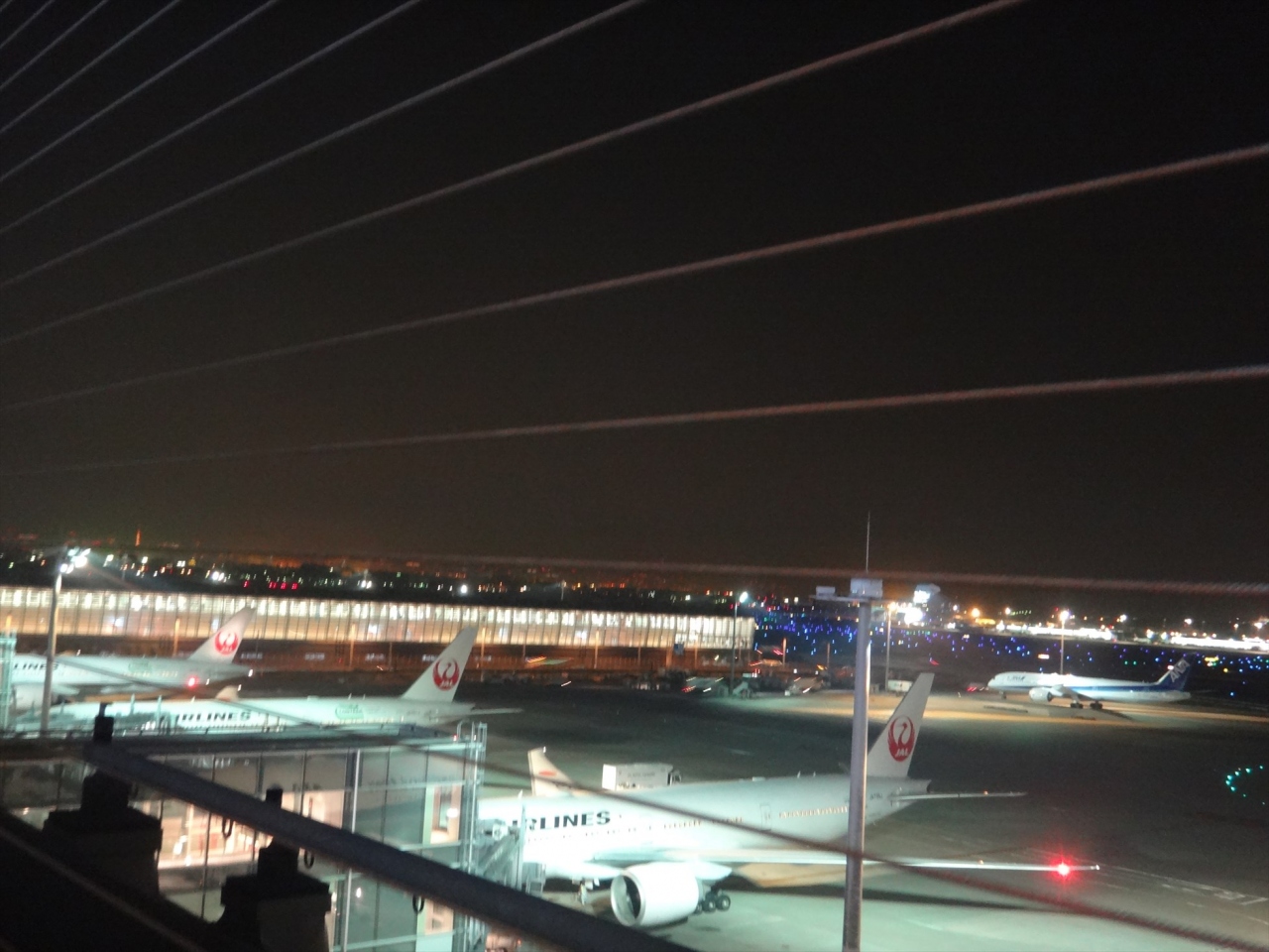 国際線の展望ラウンジなので、いろいろな航空会社が混じっているのが見えますが、場所によってはJALの機体が大量に並んでいるのが見られたりもします。展望というほど高い場所からの景色ではありませんが、わりと近い距離からの眺めなので迫力は十分にあると思います。
