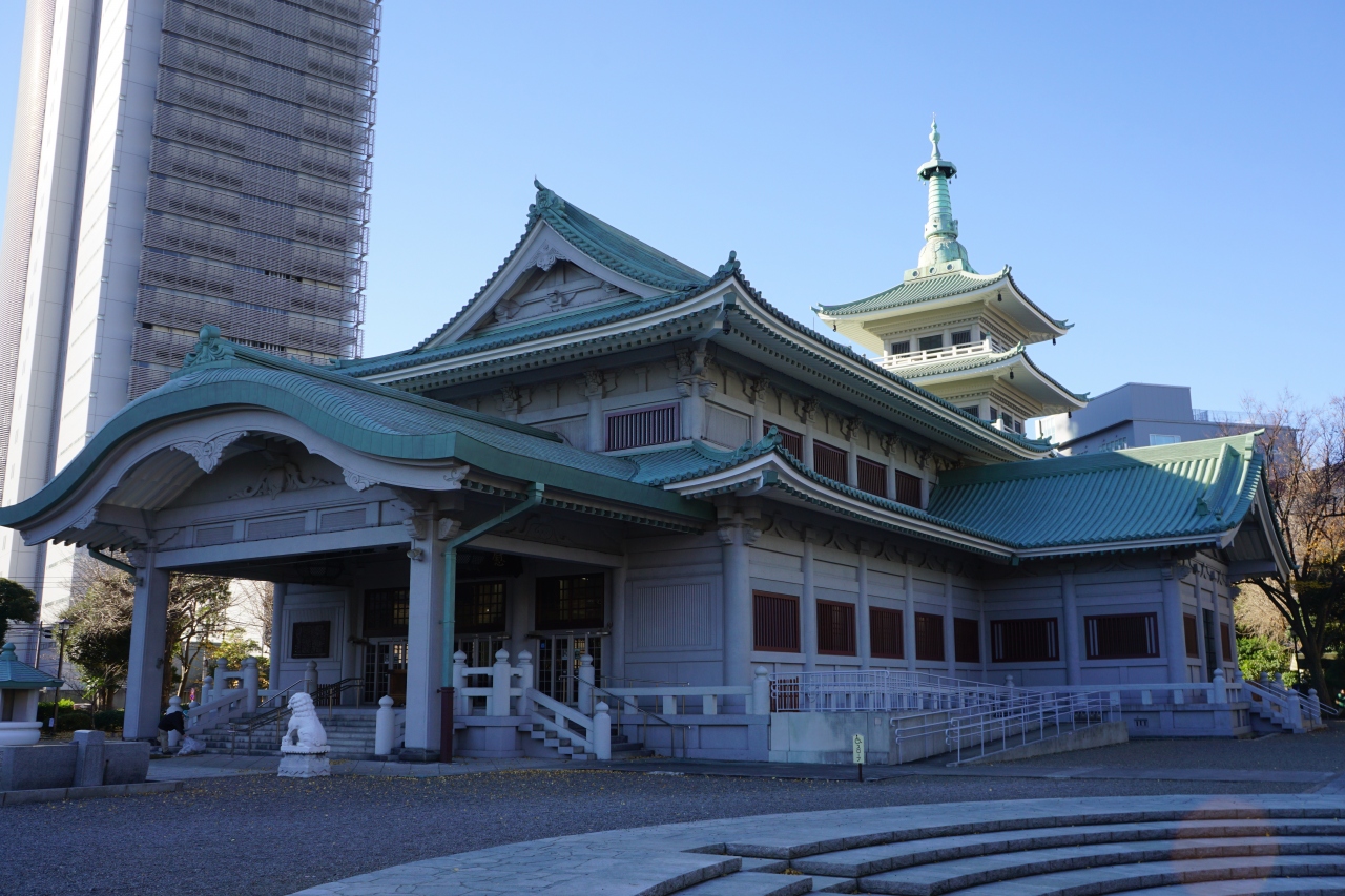 東京都慰霊堂は、横綱町公園の中心施設。関東大震災、太平洋戦争の犠牲となった16万人の人々の冥福を祈る納骨堂です。正面から見ると大きく開いた唐屋根が特徴ですが、裏側から見ると塔のような形をしていて、二つの顔を持ったような建物です。