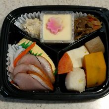 煮物や茶碗蒸し、出し巻き玉子、合鴨燻製、なます、きんぴら、卯の花が入ってます。